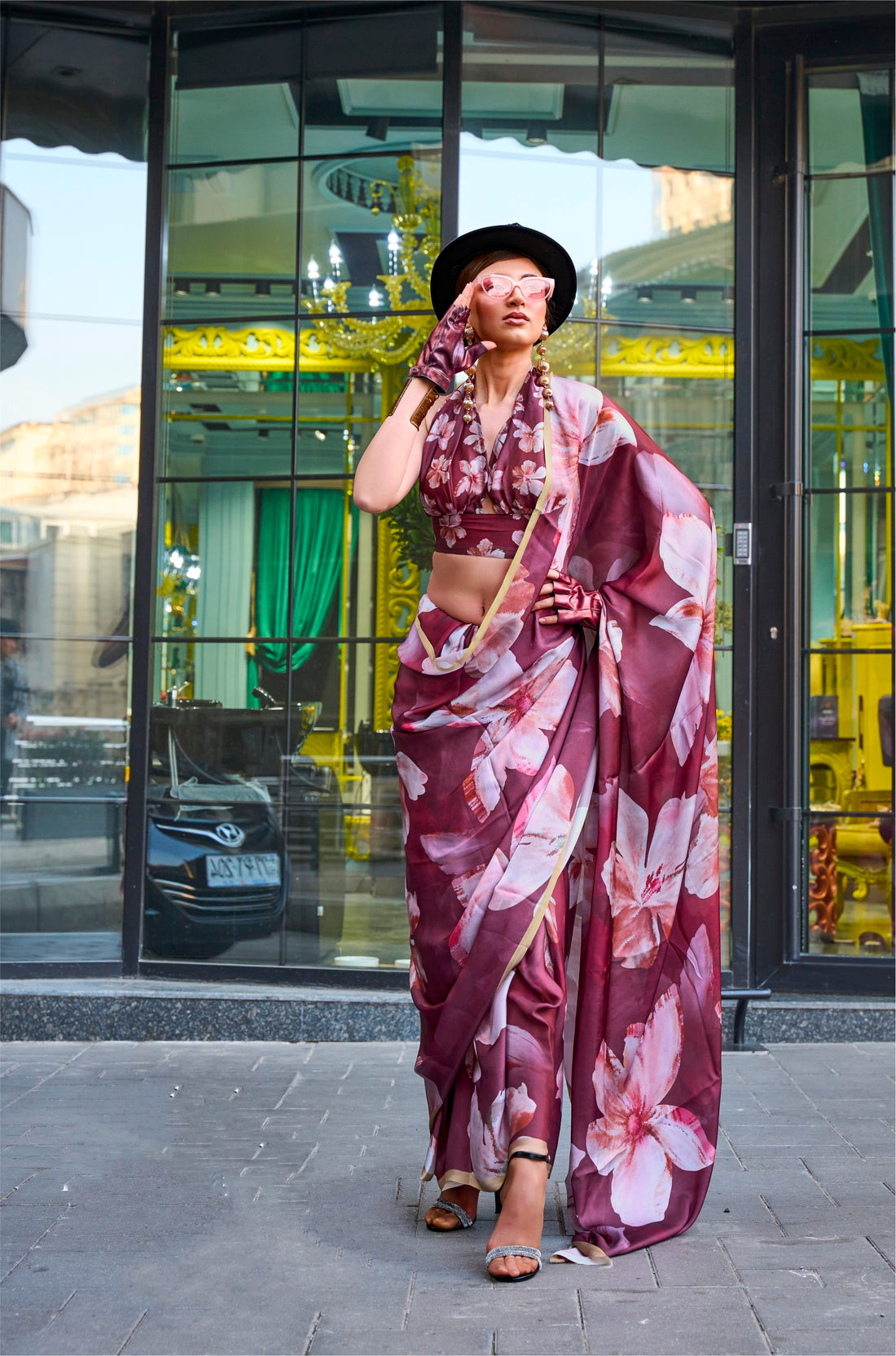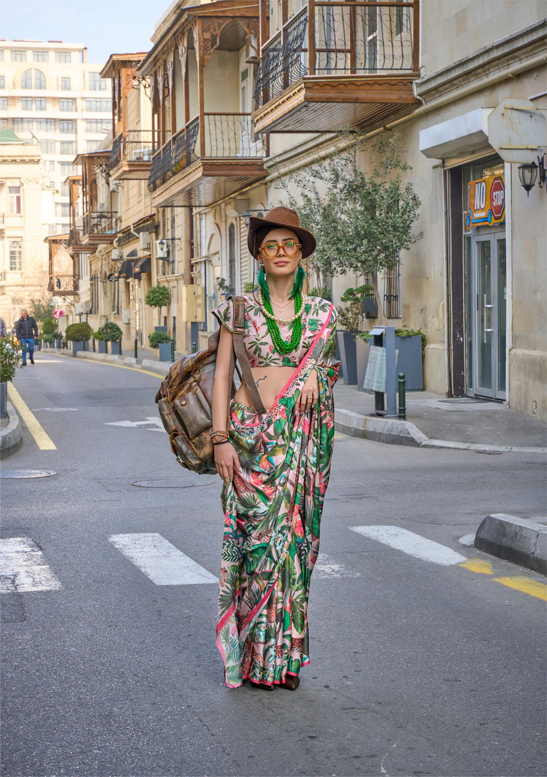 Beautiful Casual Wear Satin Crape With Modern Contemporary Print Saree