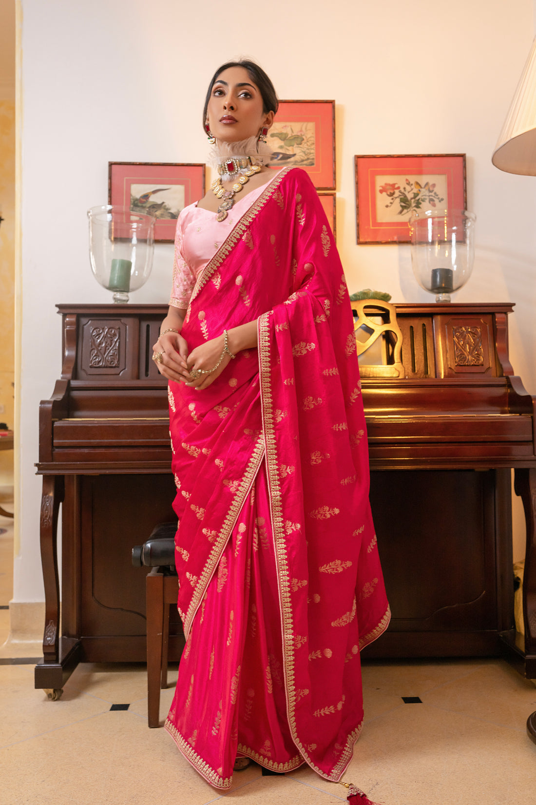 Red Viscose Satin Silk Saree with Zari Motifs and Sequin Embroidery