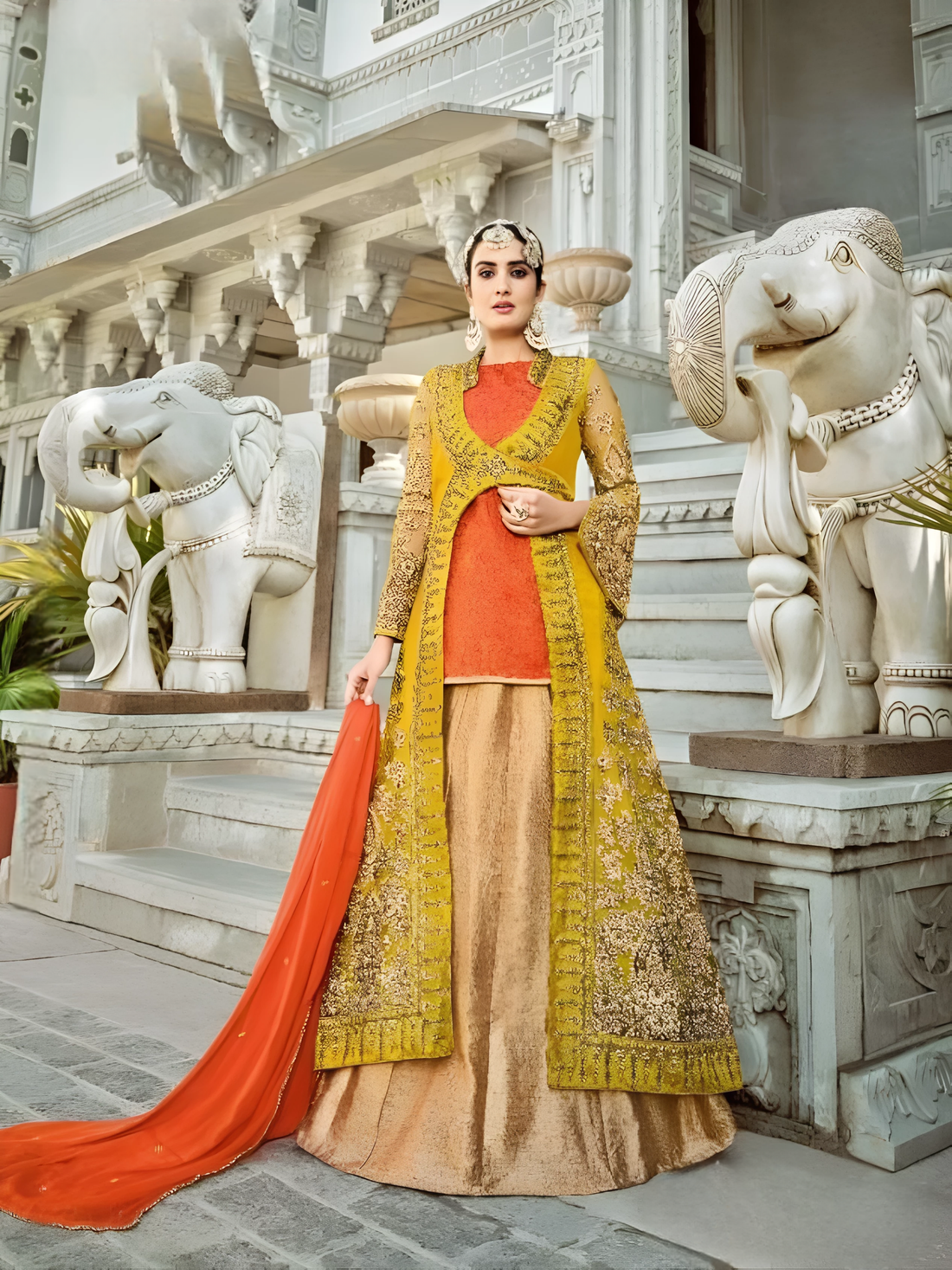 This golden yellow and orange Anarkali suit is designed for grand festive occasions, haldi ceremonies,...