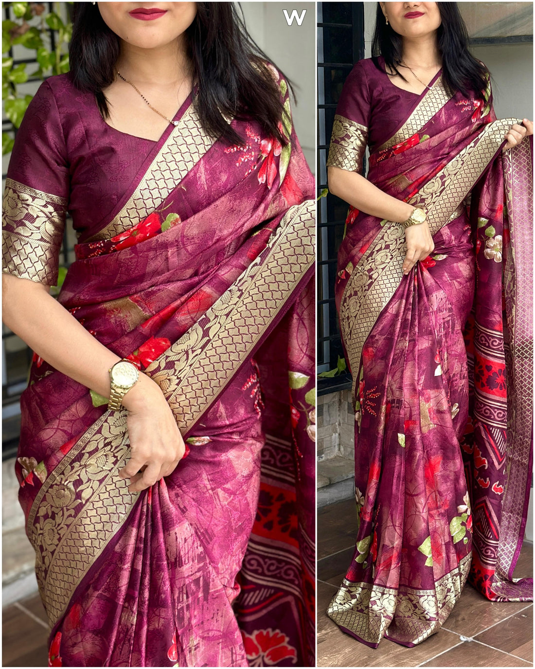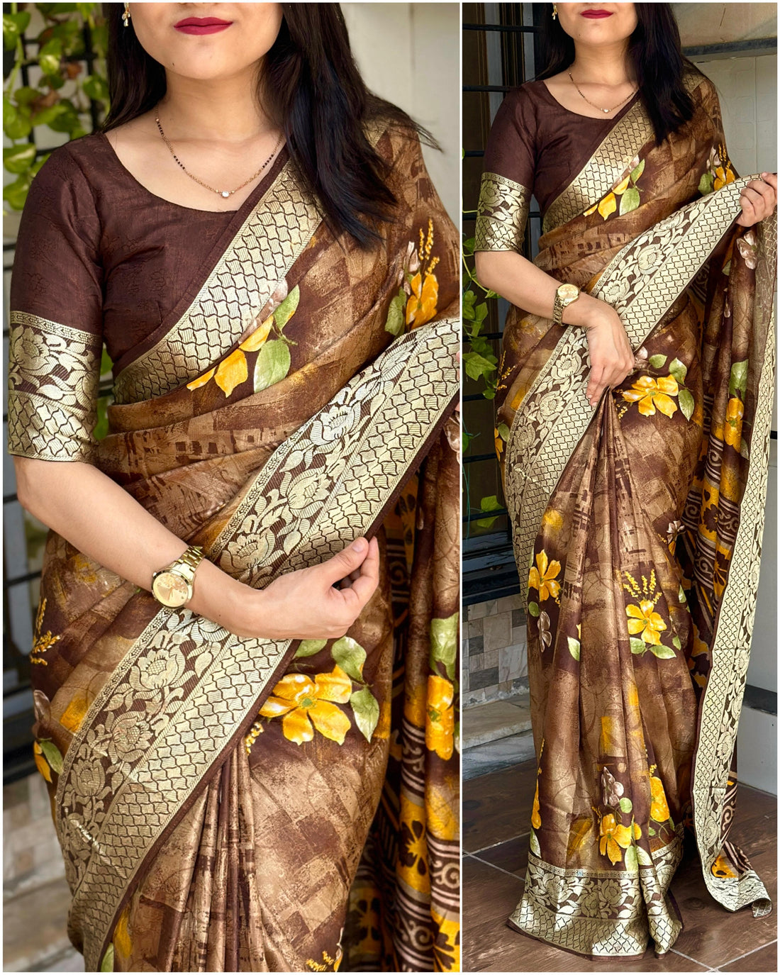 Beautiful Designer Pure Zari Linen With Floral Print Saree
