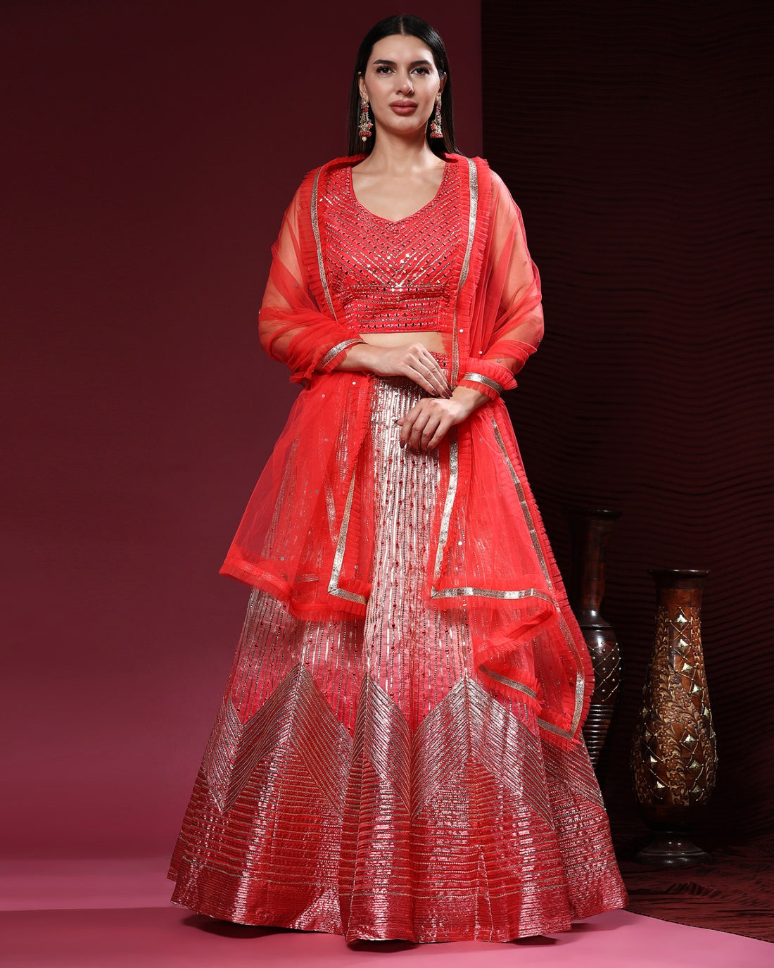 Beautiful Designer Mirror Red Coding Organza Lehenga Choli