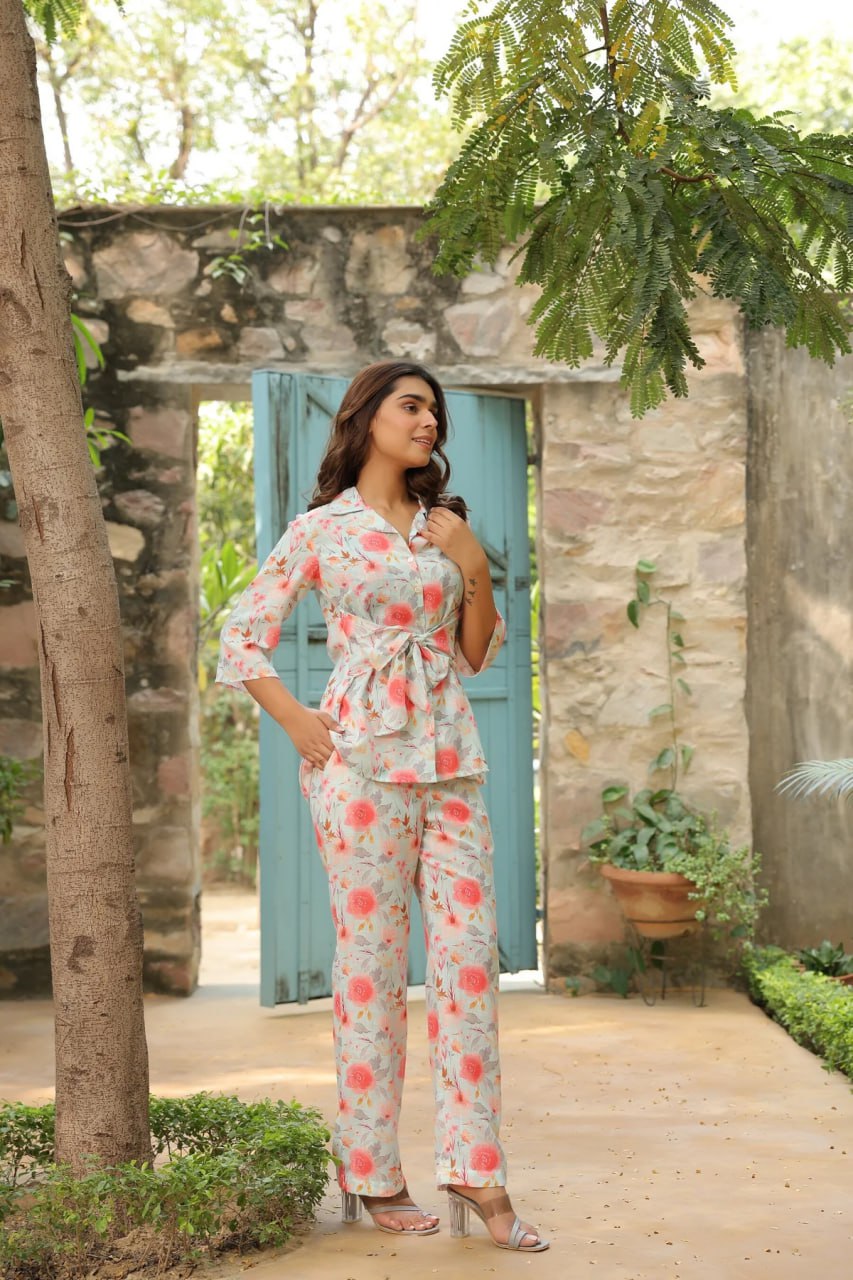 Beautiful Designer Floral Printed Lapel Cotton Co Ord Set