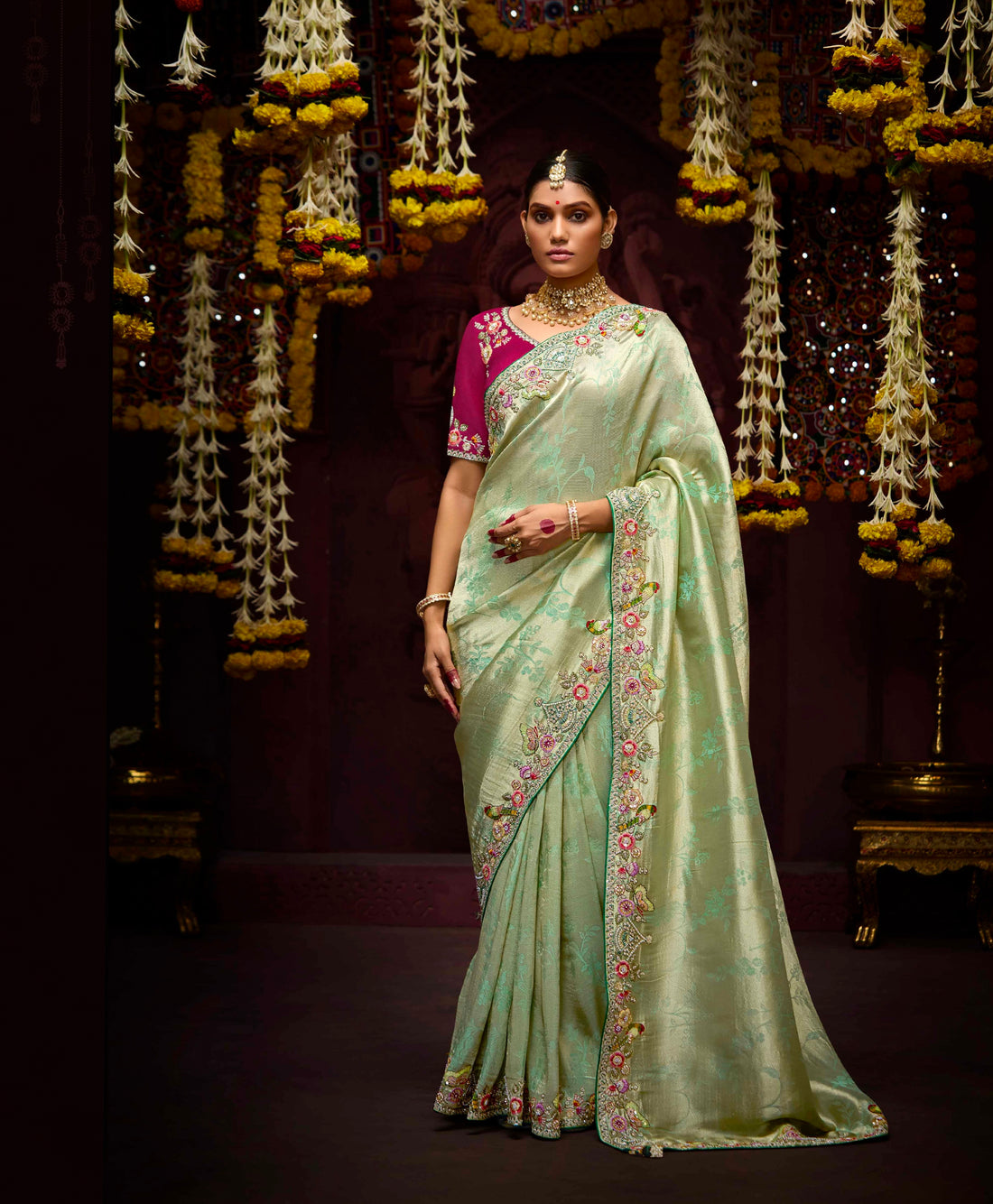 Mint Green Banarasi Kanjivaram Saree & Heavy Embroidery & Pearl Work