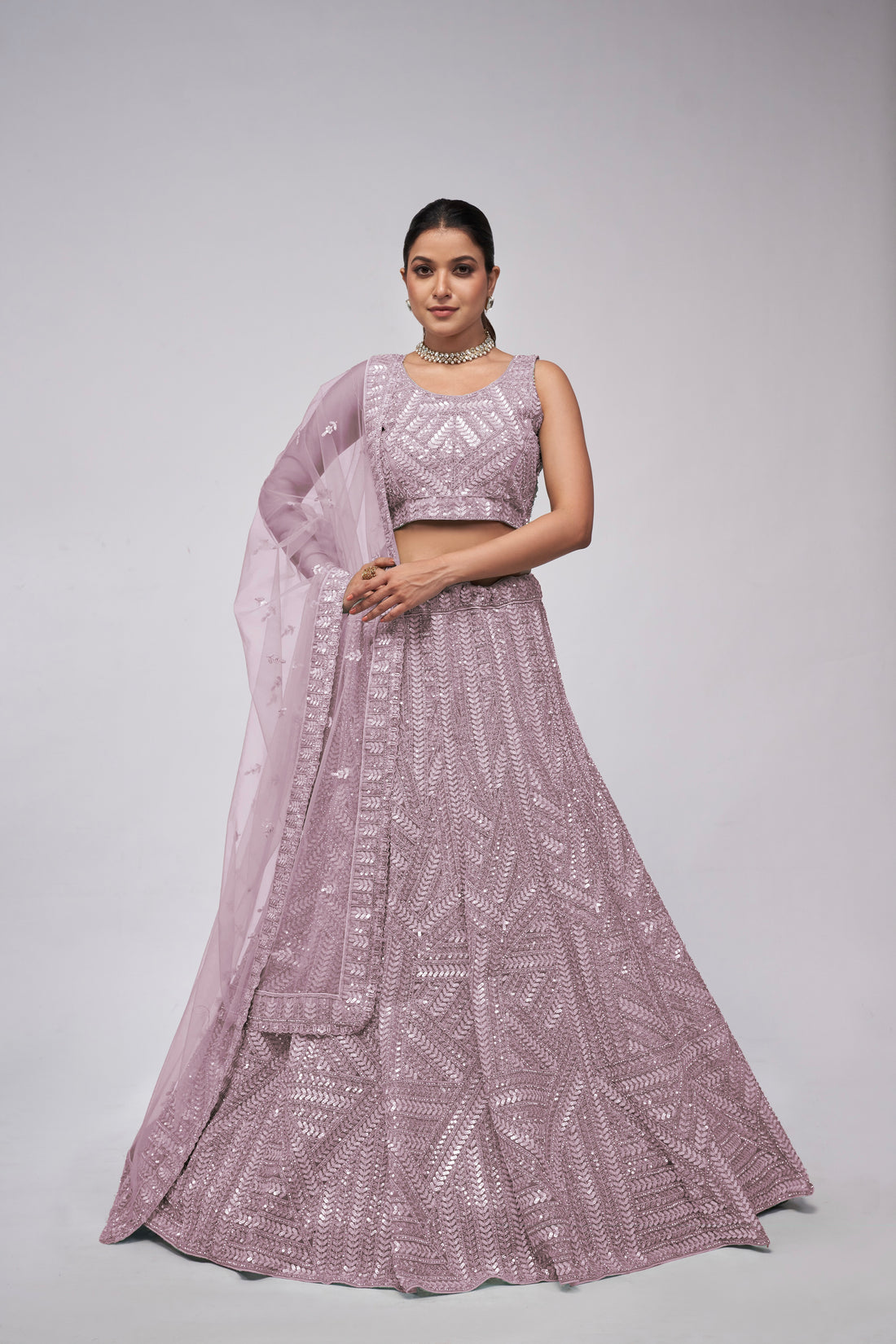 Elegant Mauve Net Lehenga with Sequin Leaves - Bridal Wear