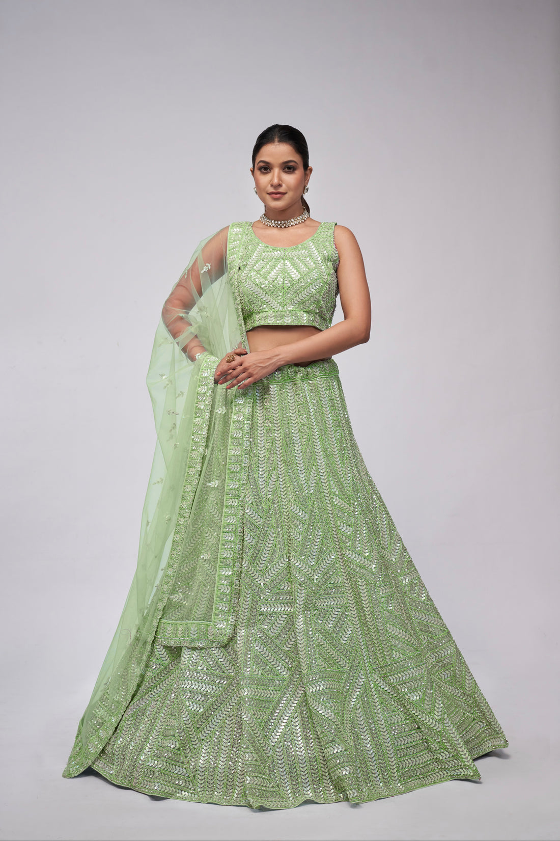 Elegant Green Net Lehenga with Sequin Leaves - Bridal Wear