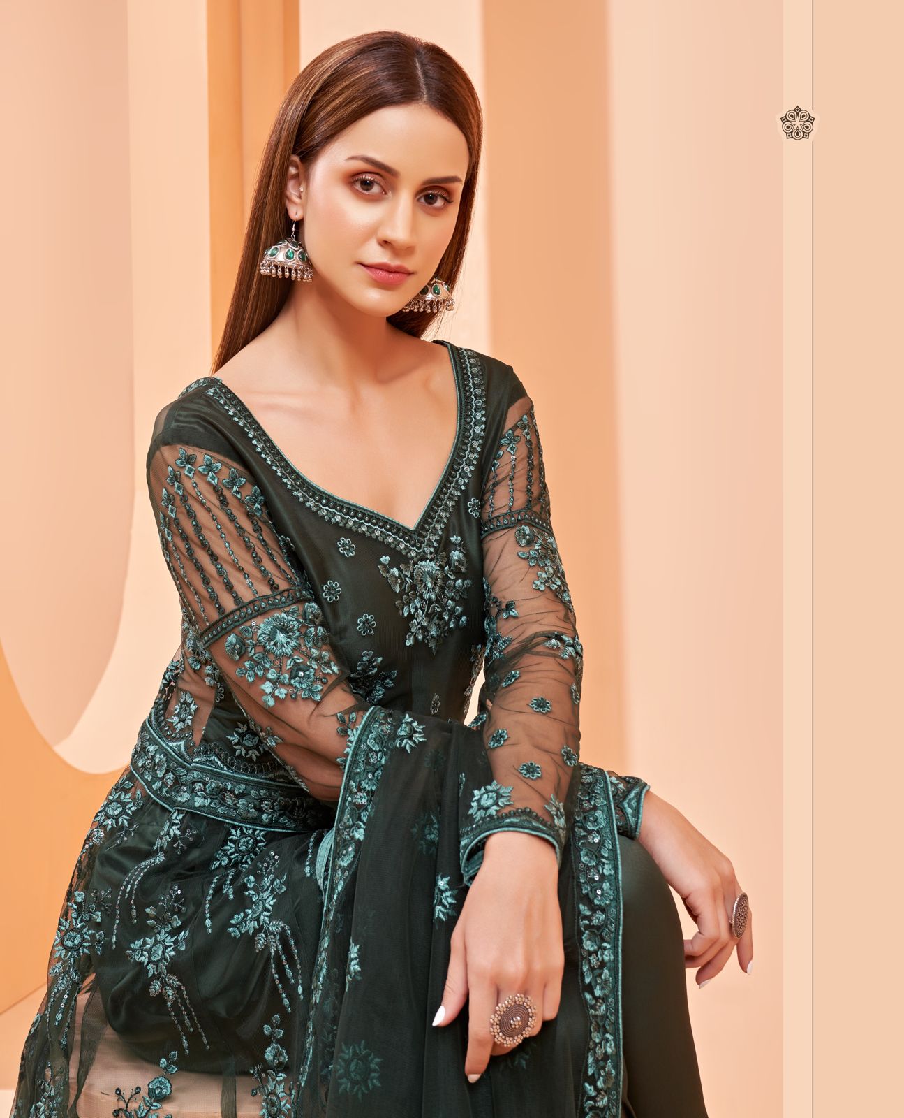 Alizeh Gul Bahaar Dark Green Heavy Embroidered Net Stylish Anarkali Gown