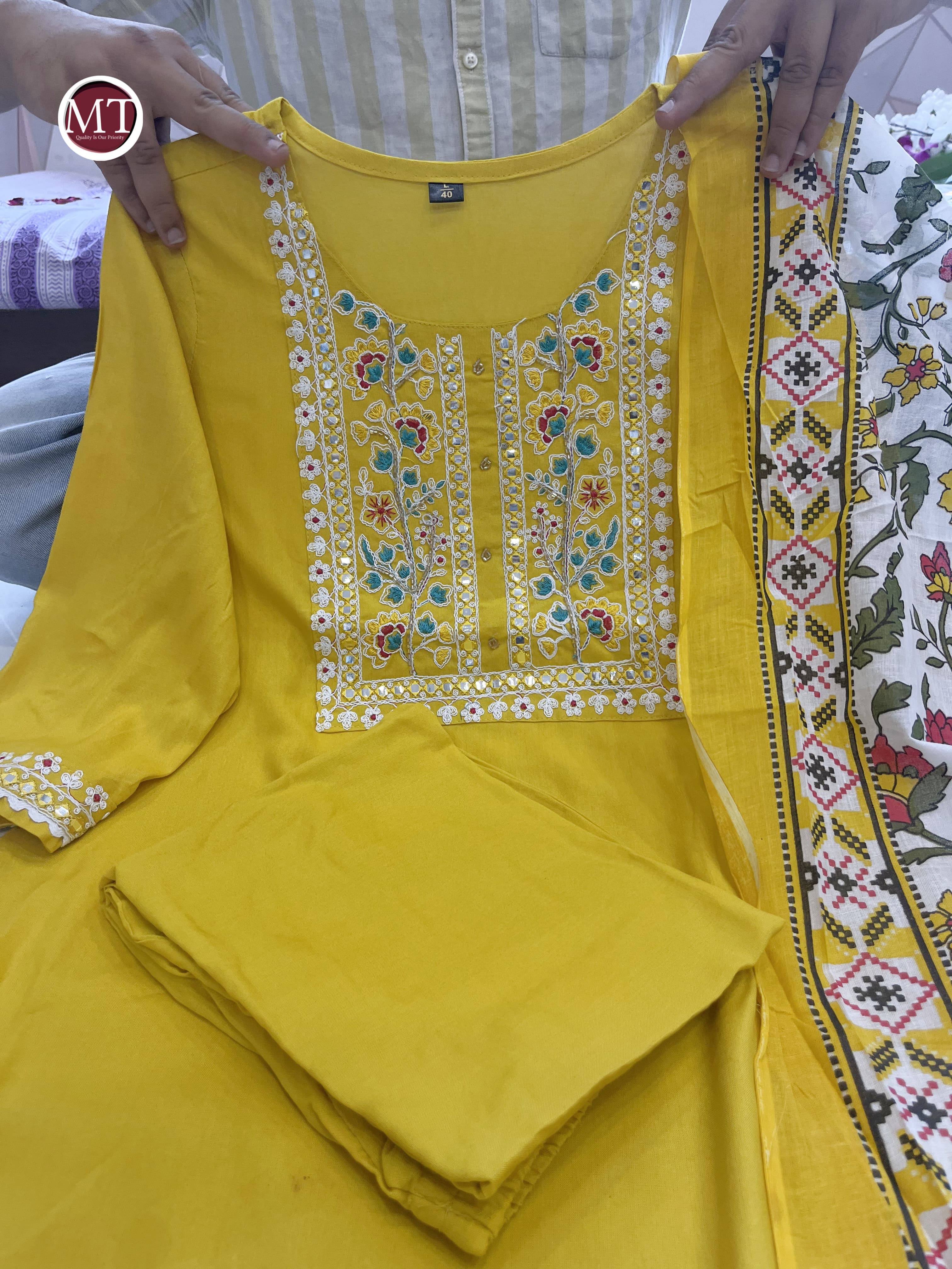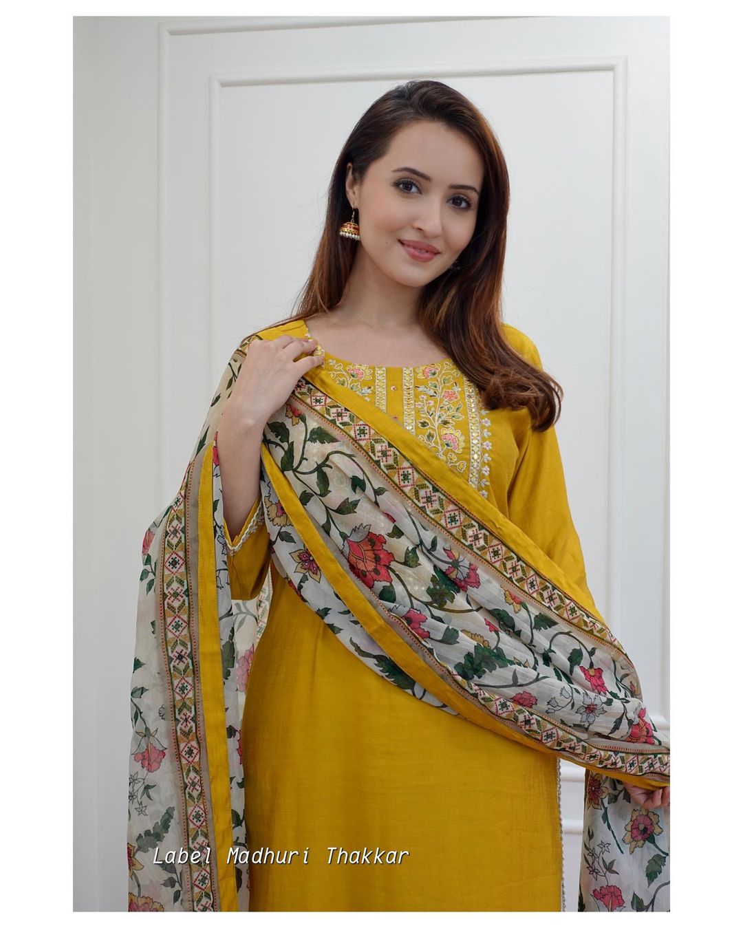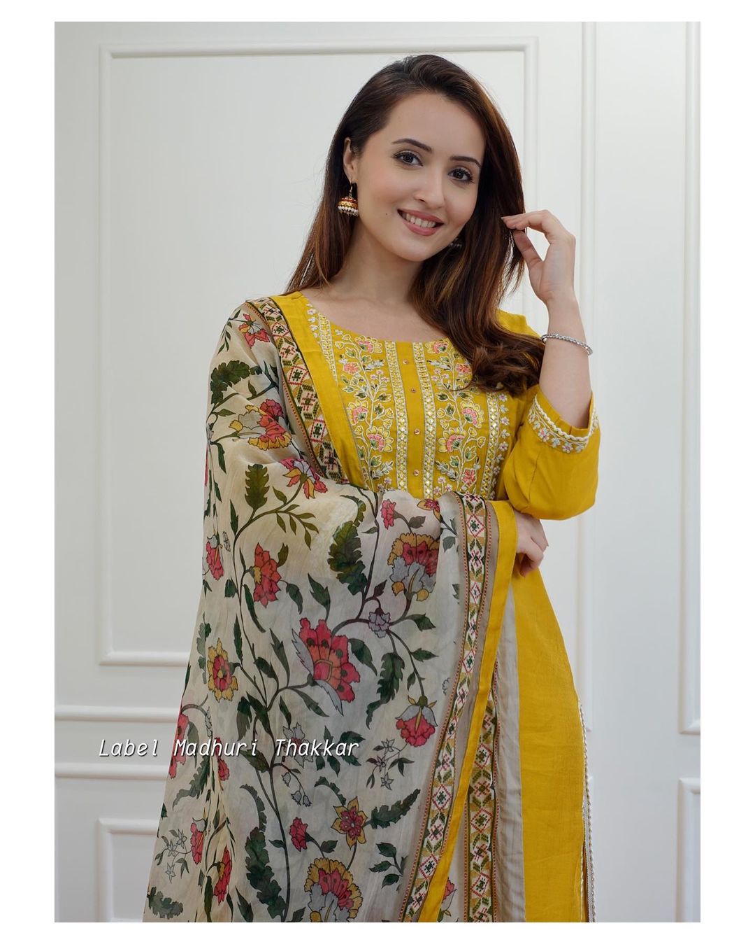 Beautiful Festive Collection just launched. Accentuated by Intricate Hand Embroidery Details on these Maroon and Must Yellow Reyon Silk Sets Paired With Matching Pants And Dupatta is sure to See You Through Festive Occasions