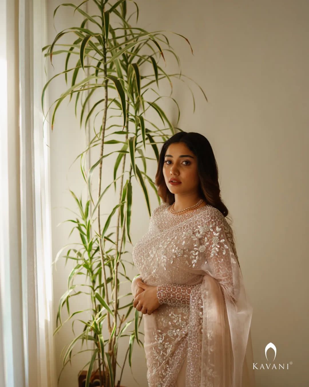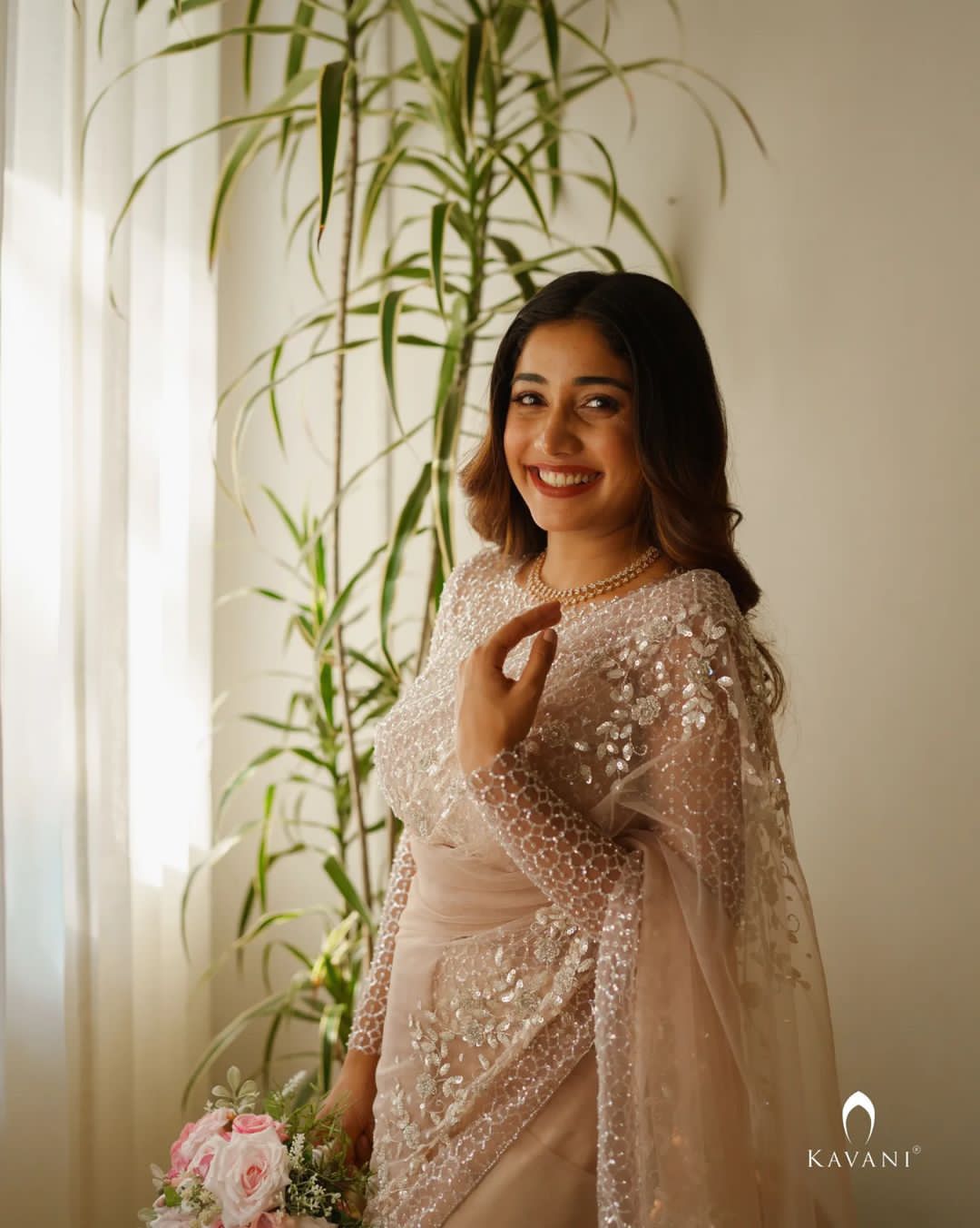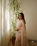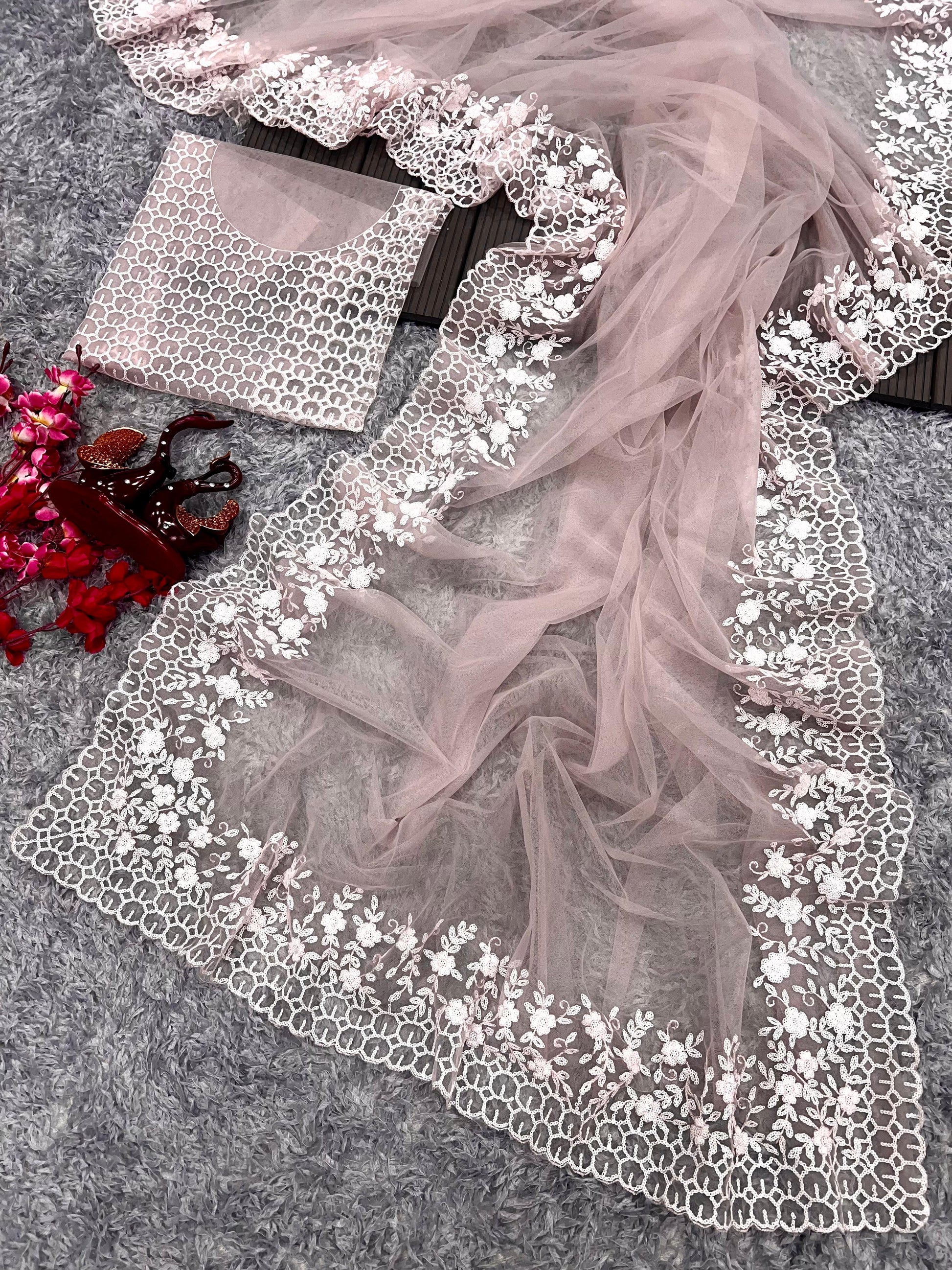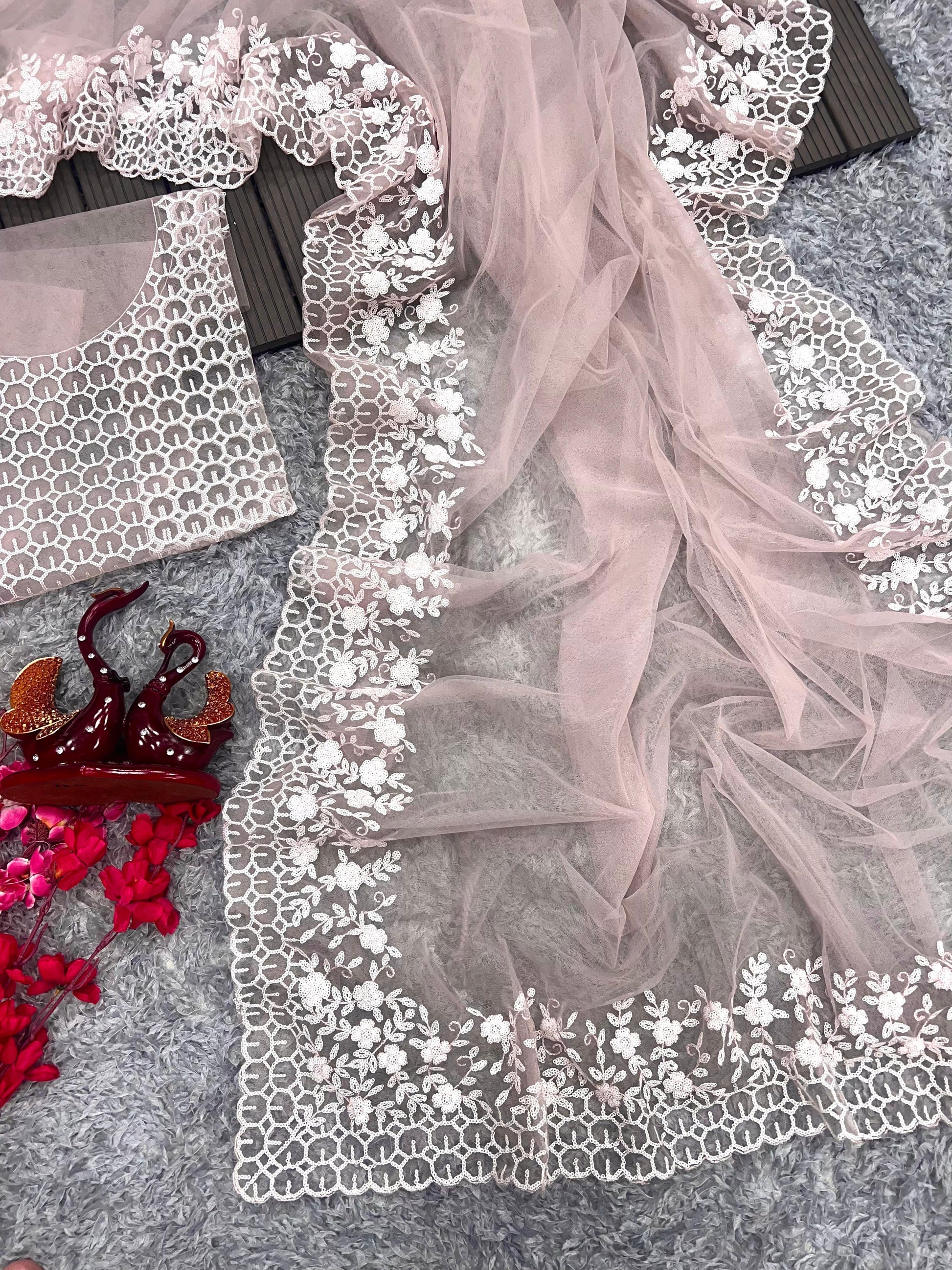 The ethereal looks resplendent in our pink soft net saree. The drape showcases a scallop border with embroidery details Matched with a designer blouse, is a vision of majesty