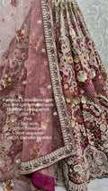 This peach lehenga showcases exquisite embroidery and mirror work on silk, complemented by a soft pink dupatta for a timeless elegance.
