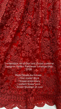 The vibrant red lehenga is adorned with rich golden embroidery and a delicate net dupatta, perfect for making a bold statement.