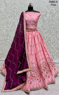 This peach lehenga showcases exquisite embroidery and mirror work on silk, complemented by a soft pink dupatta for a timeless elegance.