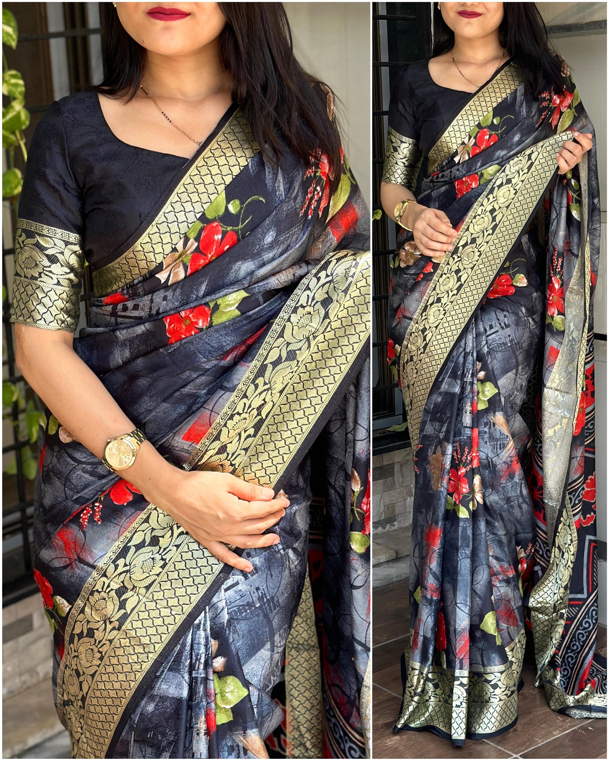 PATTERN- Designer printed saree with self jacquard pattern & zari weaving border with tussles in pallu & running printed blouse.