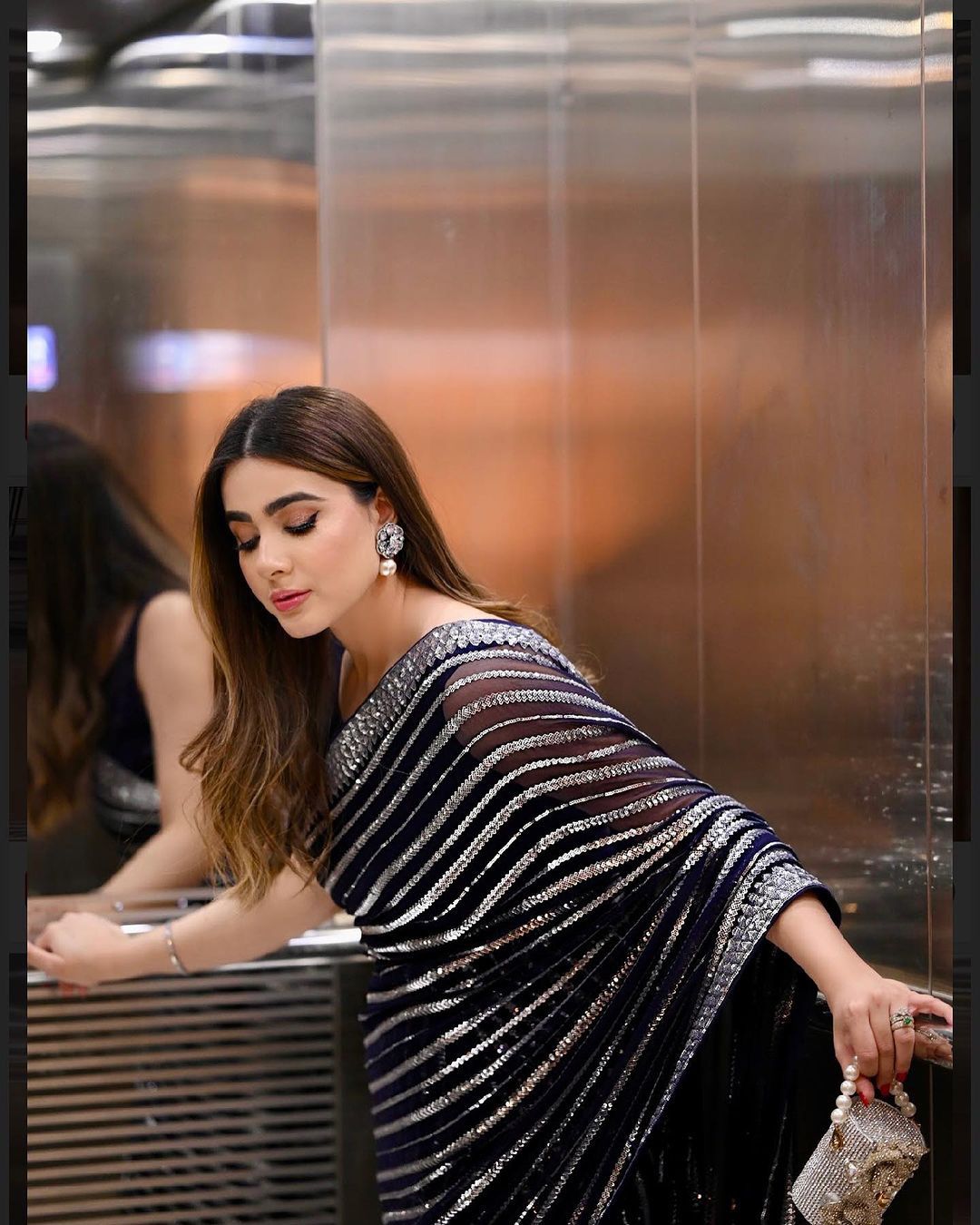 A moment in time. Like a million starts in the sublime sky, delicately handcrafted sequins work bring out the vibrancy of this silver georgette saree.