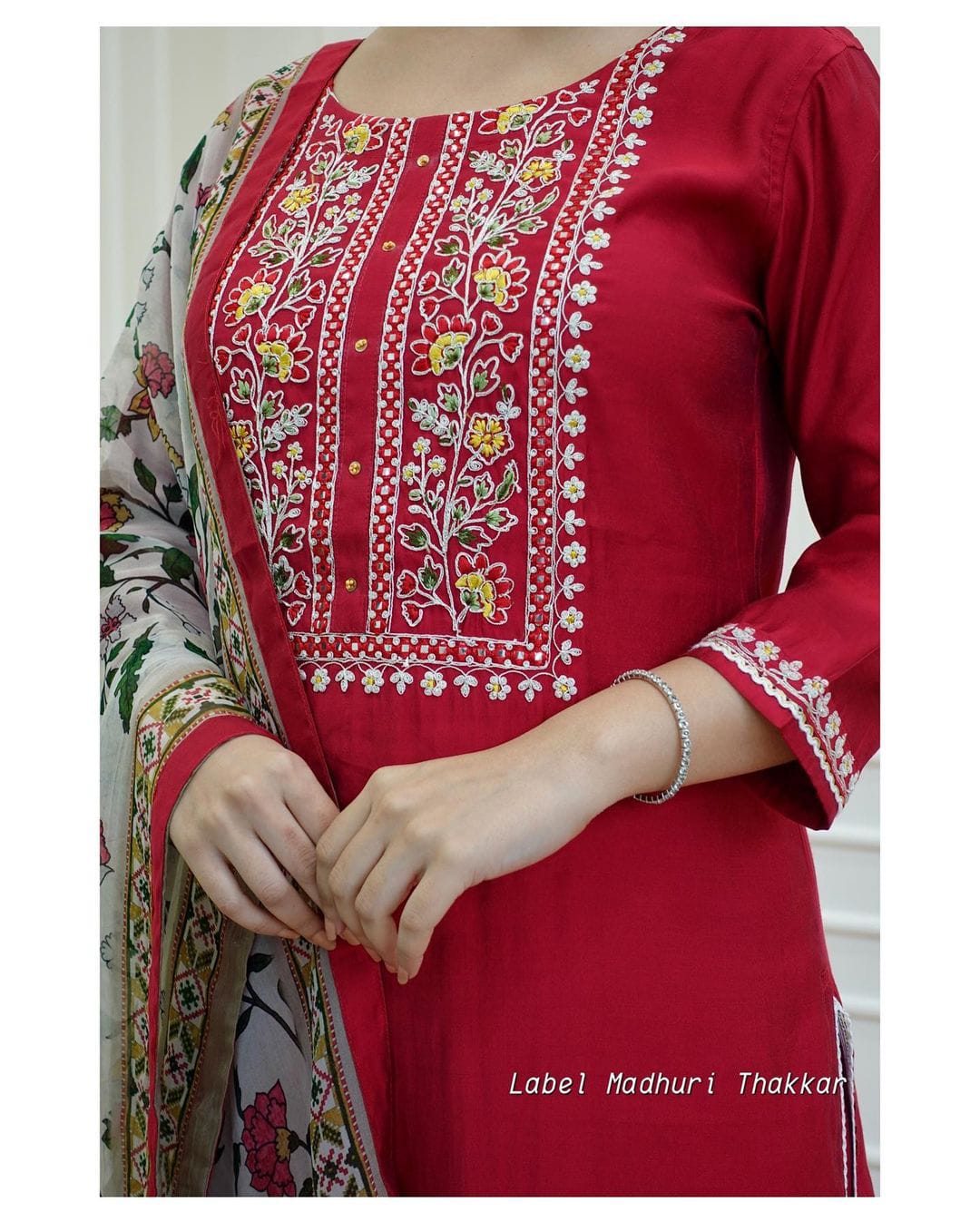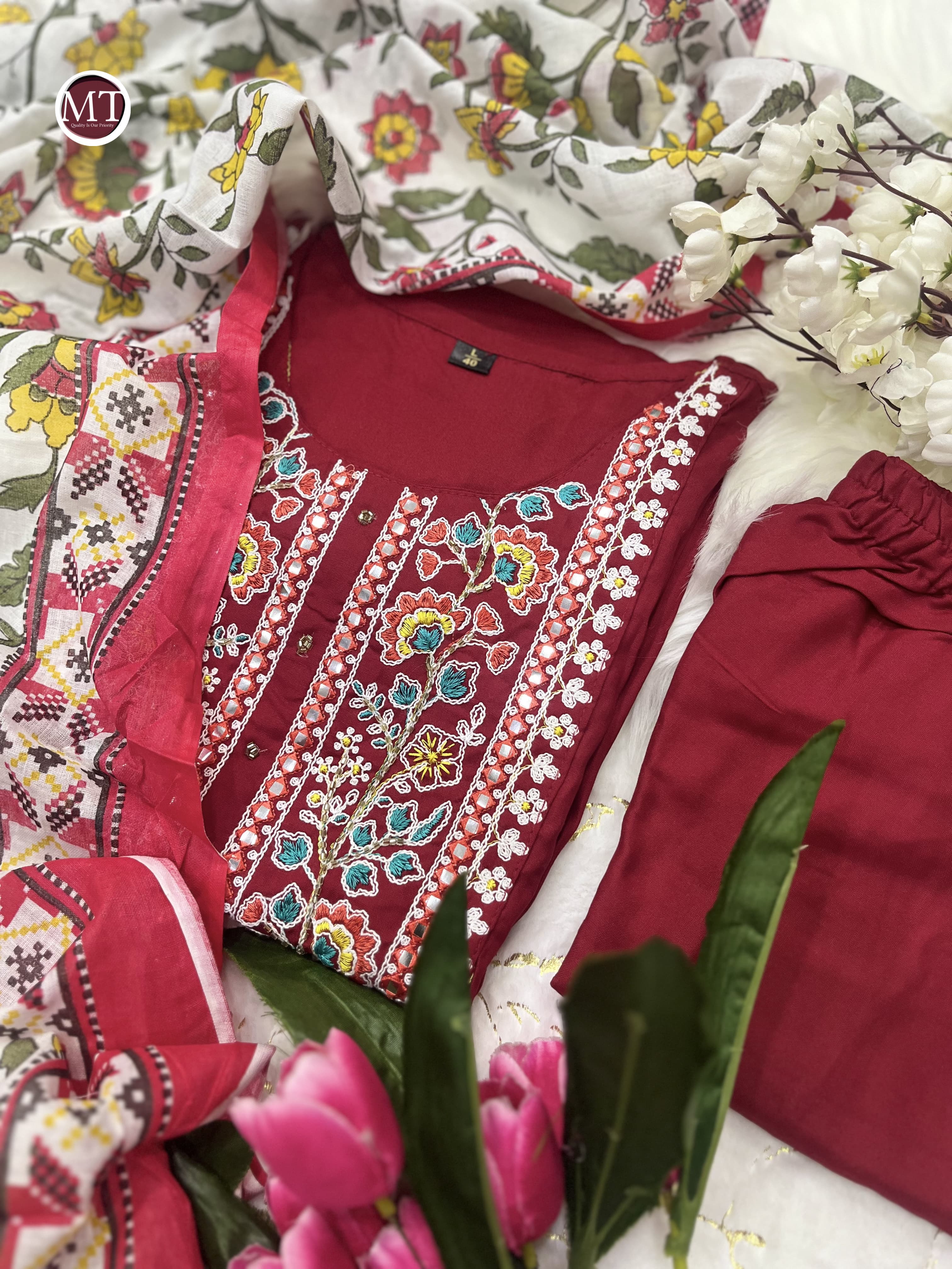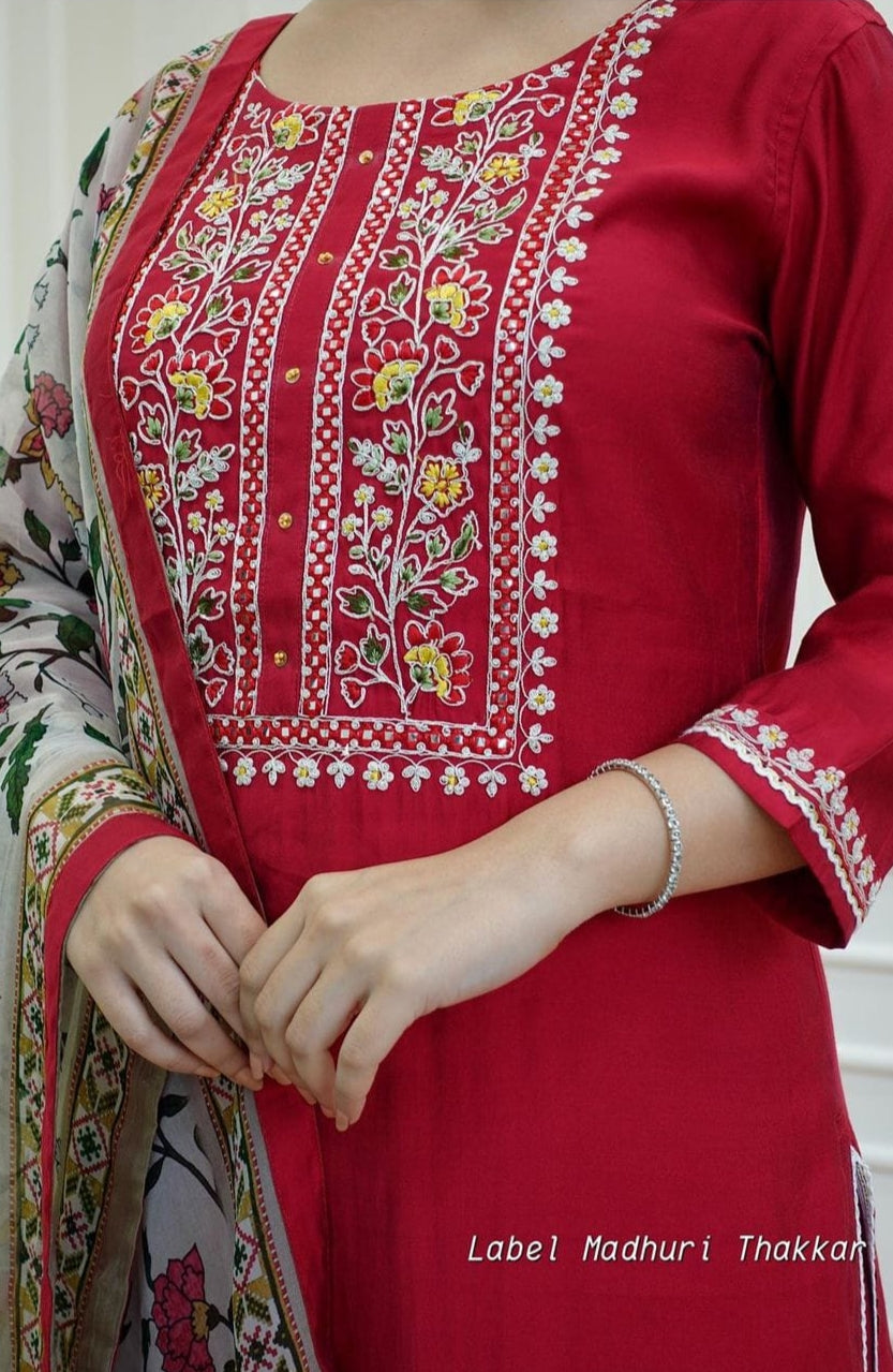 Beautiful Festive Collection just launched. Accentuated by Intricate Hand Embroidery Details on these Maroon and Must Yellow Reyon Silk Sets Paired With Matching Pants And Dupatta is sure to See You Through Festive Occasions