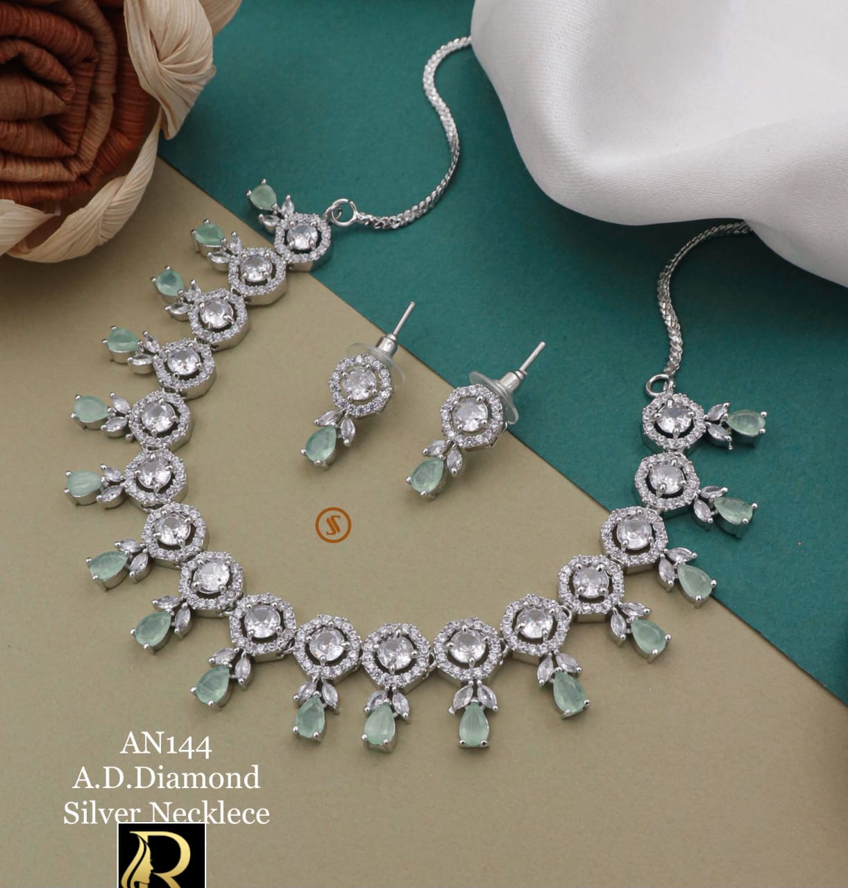 Premium Quality Most Demanding and Trending Fancy Designer Superhit Brass High Gold American Diamonds Silver / Rose Gold Stone And Diamond Necklace Set with Beautiful Earrings