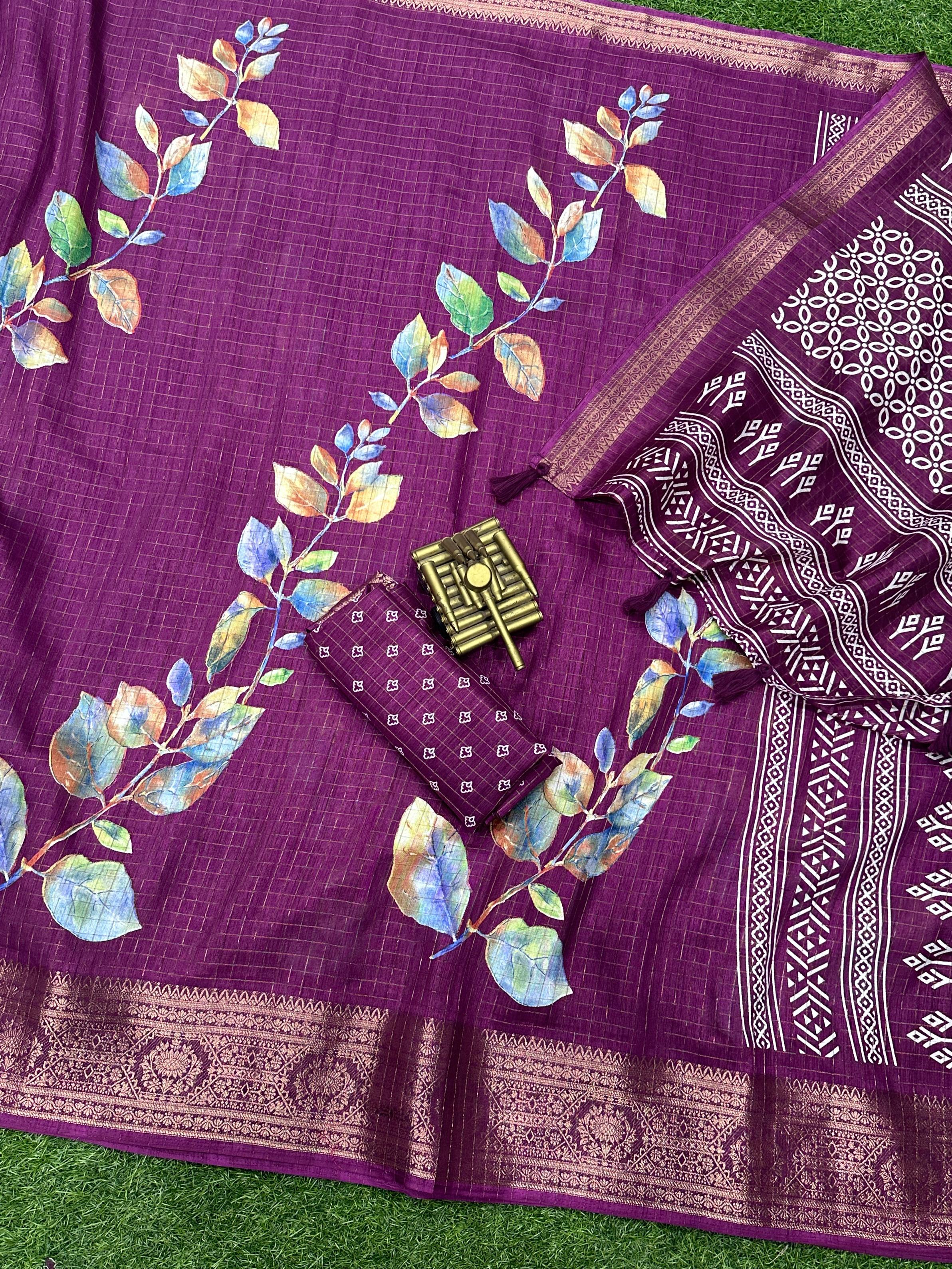 Pattern-Designer hand printed saree with zari weaving checks and boder & tussles in pallu