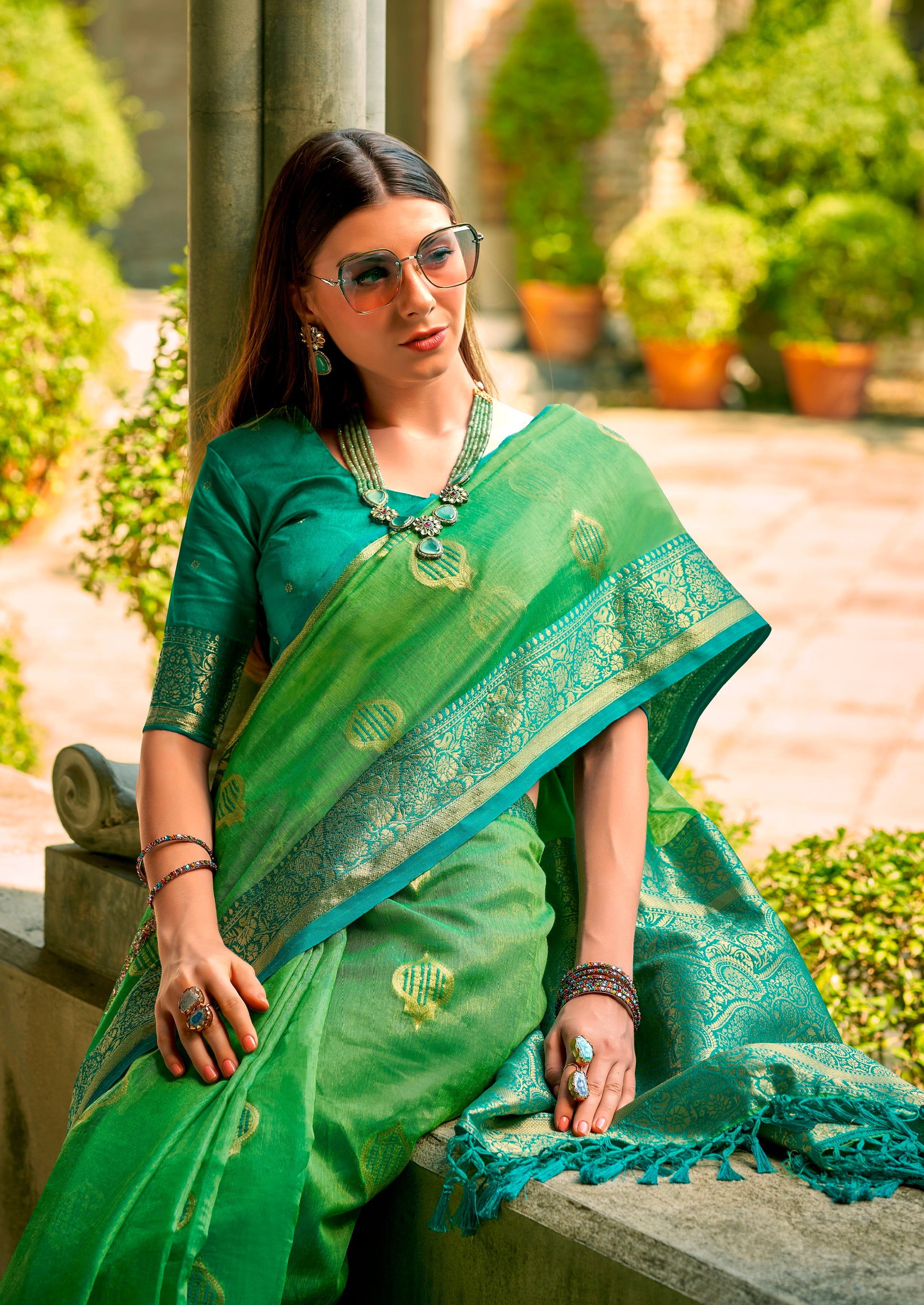This Saree Is Made From Tissue Silk Fabric Which Gives A Comfortable Feel To The Wearer. It Is Available In Bohemian Style That Makes It More Fashionable To Wear In Parties Or Functions.