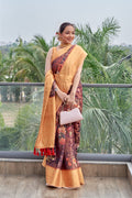 New concept of organza zari sweaving saree with 8 inch gold zari weaved border with all over anokhi jaal design and rich weaved pallu with tassels attached, with a Touch of unique digital print concept