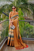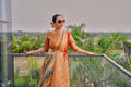 New concept of organza zari sweaving saree with 8 inch gold zari weaved border with all over anokhi jaal design and rich weaved pallu with tassels attached, with a Touch of unique digital print concept