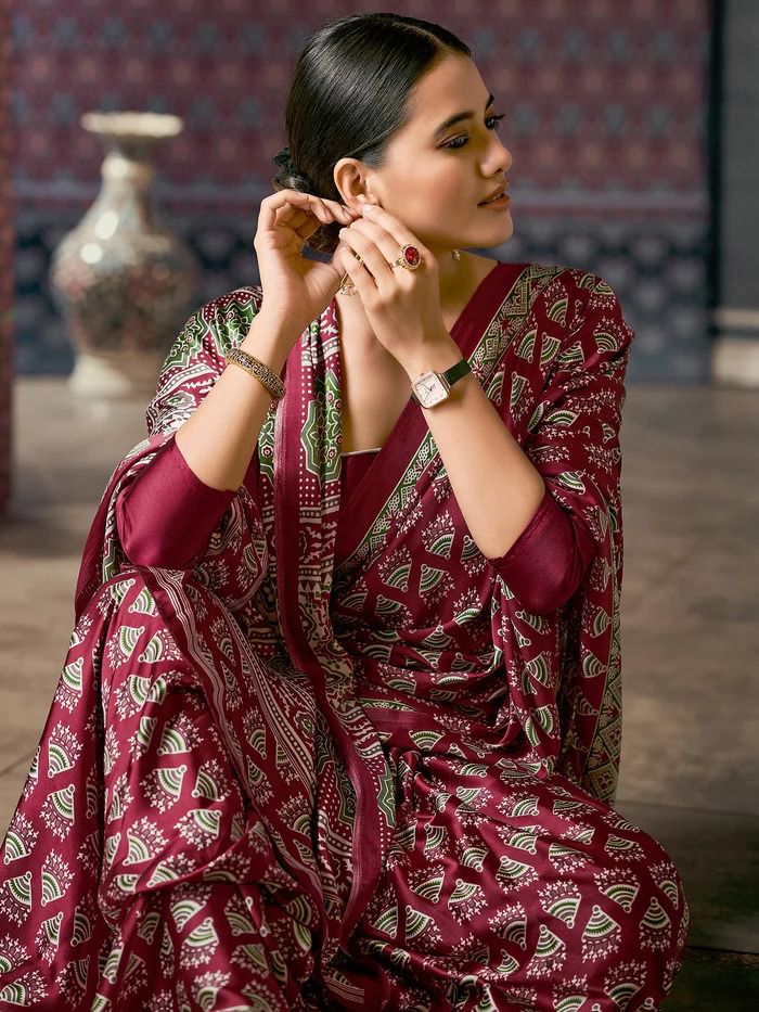Beautiful Designer Party Wear Ajrakh Print Japan Crape Saree Beautiful Designer Party Wear Ajrakh Print Japan Crape Saree