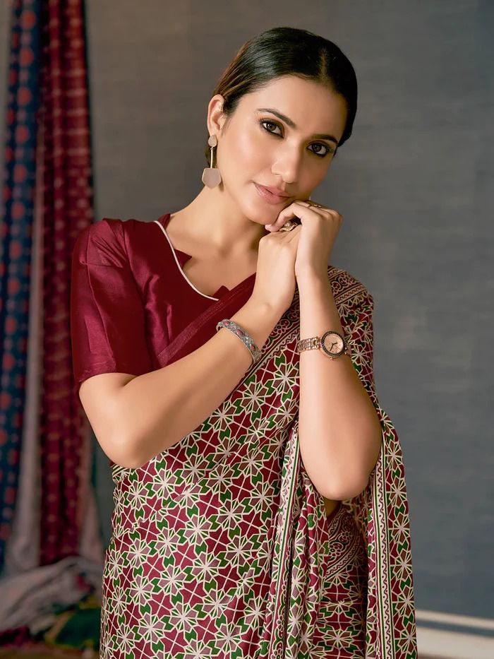 Beautiful Designer Party Wear Ajrakh Print Japan Crape Saree