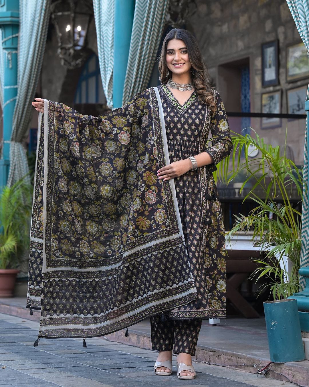 For a Festive gathering, you'll can opt for our Navye blue Floral Afghani suit set which is decorated with finest embroidery, side waist tassels and motifs.It is paired with matching Afghani pants and dupatta
