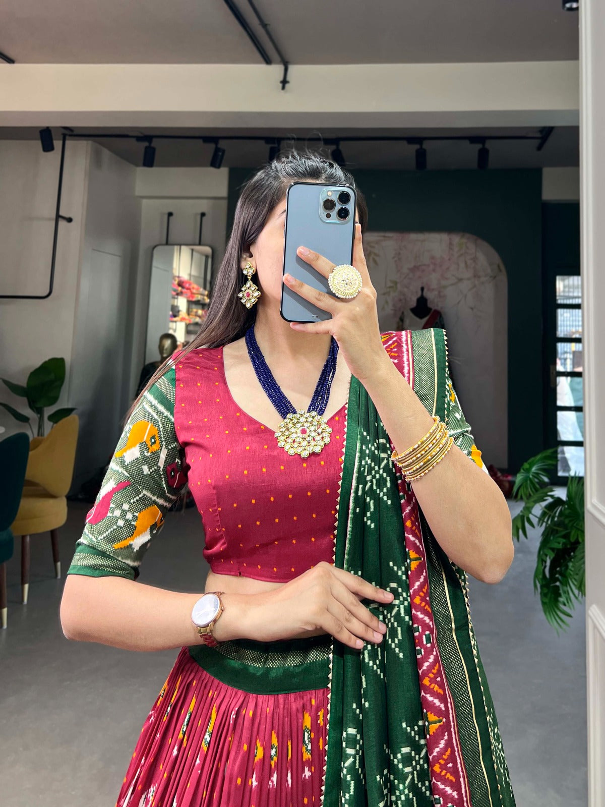 Adorn yourself in the artistry of Tussar silk and the mesmerizing allure of ikkat Patola prints with this exquisite lehenga choli ensemble