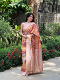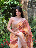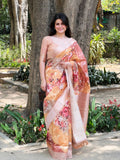 Premium Maheshwari silk saree with all over zari woven pattern and graceful digital floral print on it with zari woven border and rich pallu with attractive lace at end and Running blouse Piece