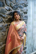 Premium Tussar silk saree with zari woven border and classic fabric pattern all over with traditional contrast weaving pallu and contrast blouse piece