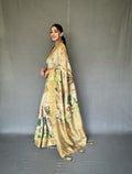 Pure tussore silk saree with beautiful fusion conceptual prints and jacquard weaving gold zari border with combination of contrast digital and weaving pallu with beautiful tassels and printed contrast blouse