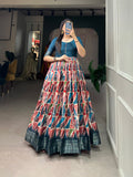 This teal and gold lehenga features intricate embroidery and mirror work, paired with a pink dupatta for a stunning, regal look.