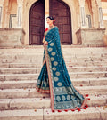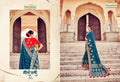 This teal and gold lehenga features intricate embroidery and mirror work, paired with a pink dupatta for a stunning, regal look.