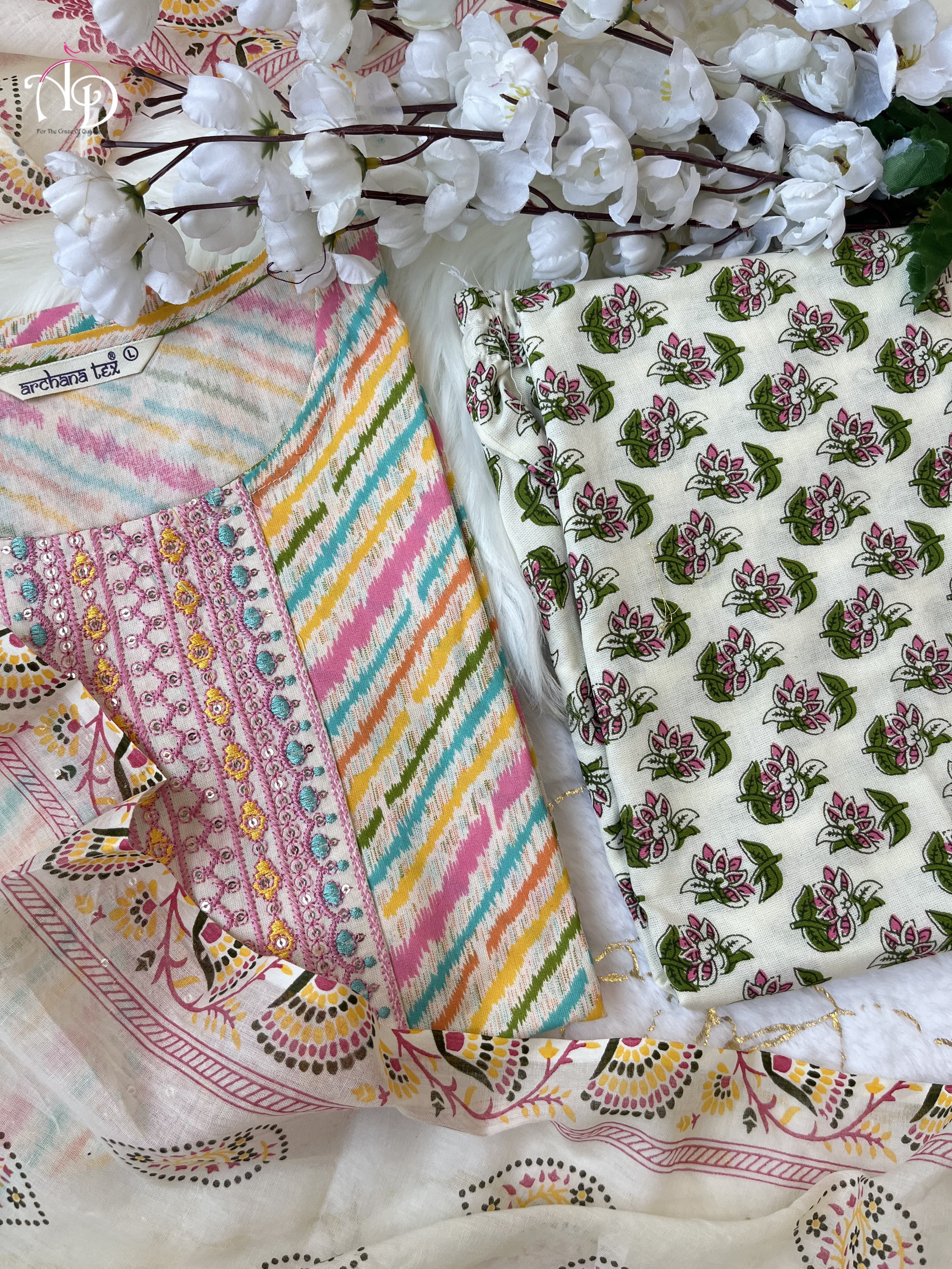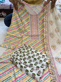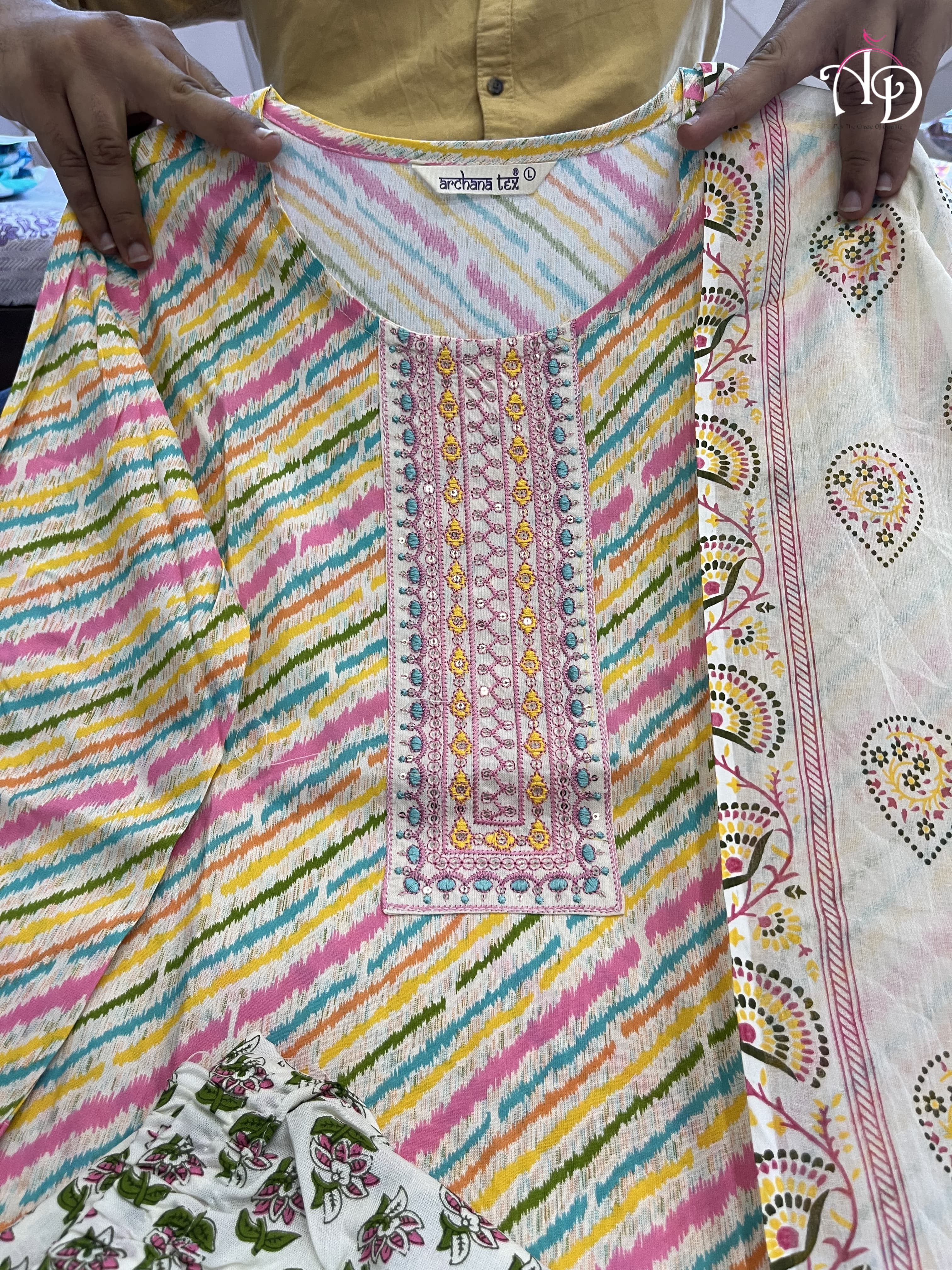 Designer Fine Cotton Suit set Full Flaired Leheriya Print stright Suit With FULL Embroidery Hilighting on your neck Beutiful Full length DUPPTA Stright pent Beutiful DUPPTA FULL 3 PIECE SET