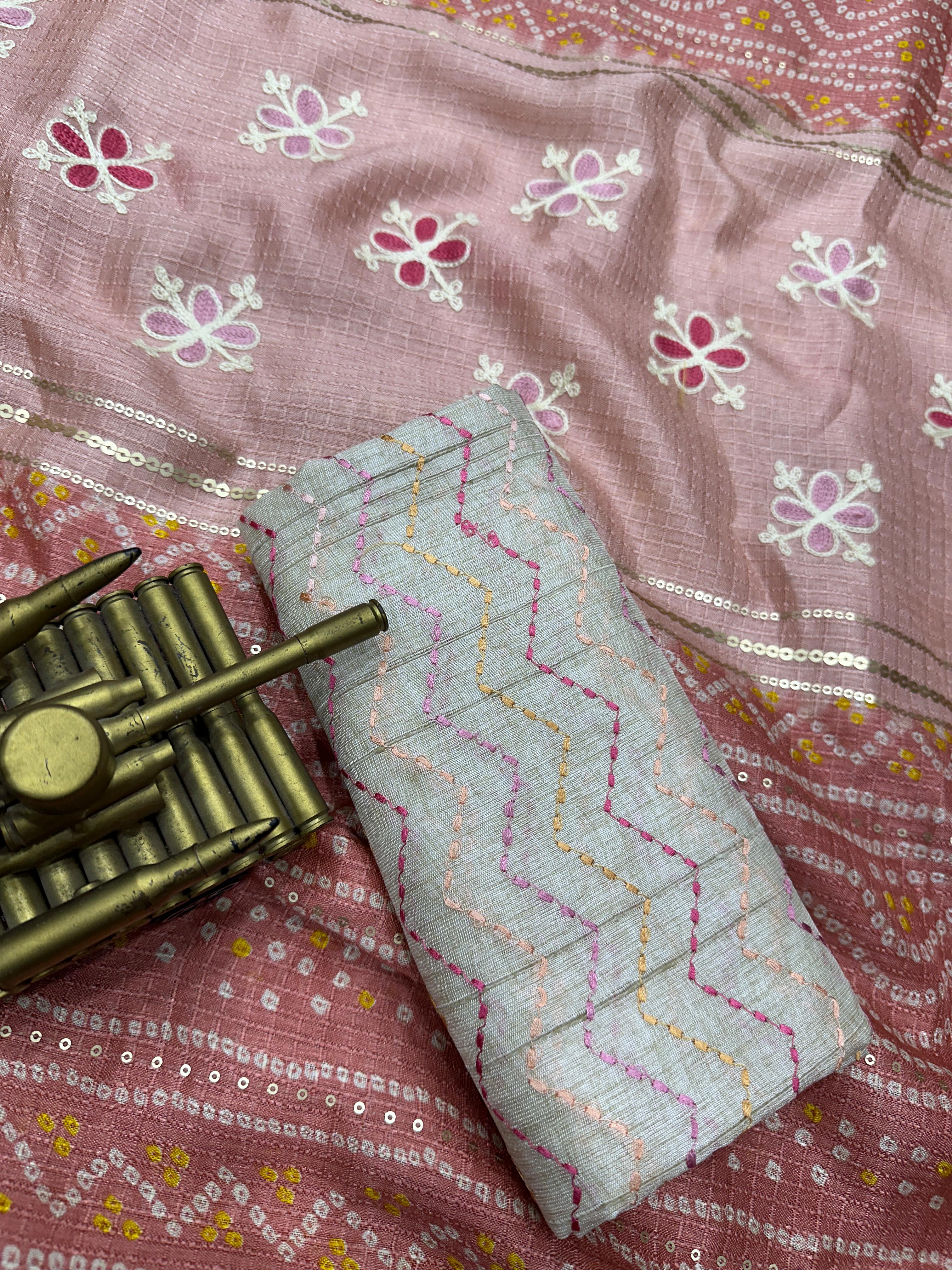 Saree- Bandhej print with matt sequin khatha work and multi thread work