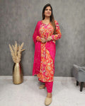 Featuring beautiful MUSLIN ALIA CUT Suit Set which is beautifully decorated with intricate hand embroidery, Zari weaving and prints. It is paired with matching pants and lace dupatta