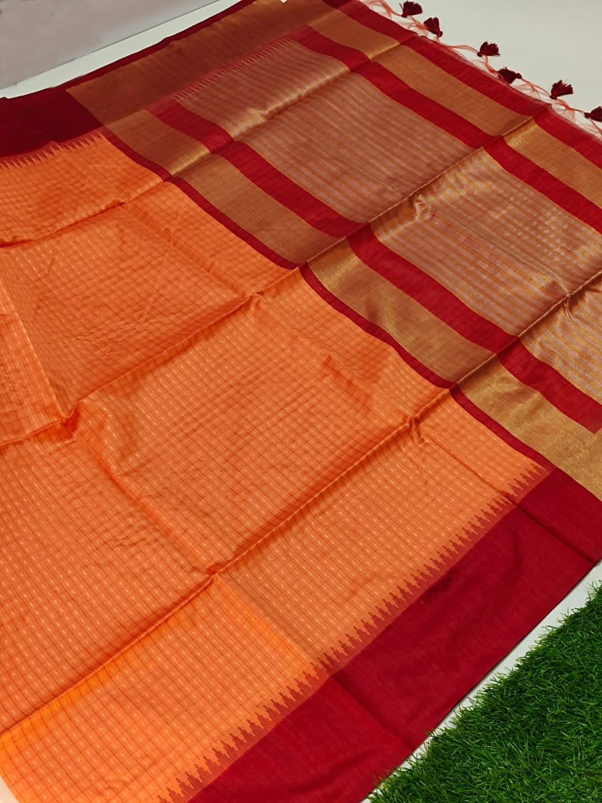 Semi Tussar silk saree with contrast Bomkai Temple Border and contrast ikkat pallu with all over ikkat weaves checks with fancy tassels