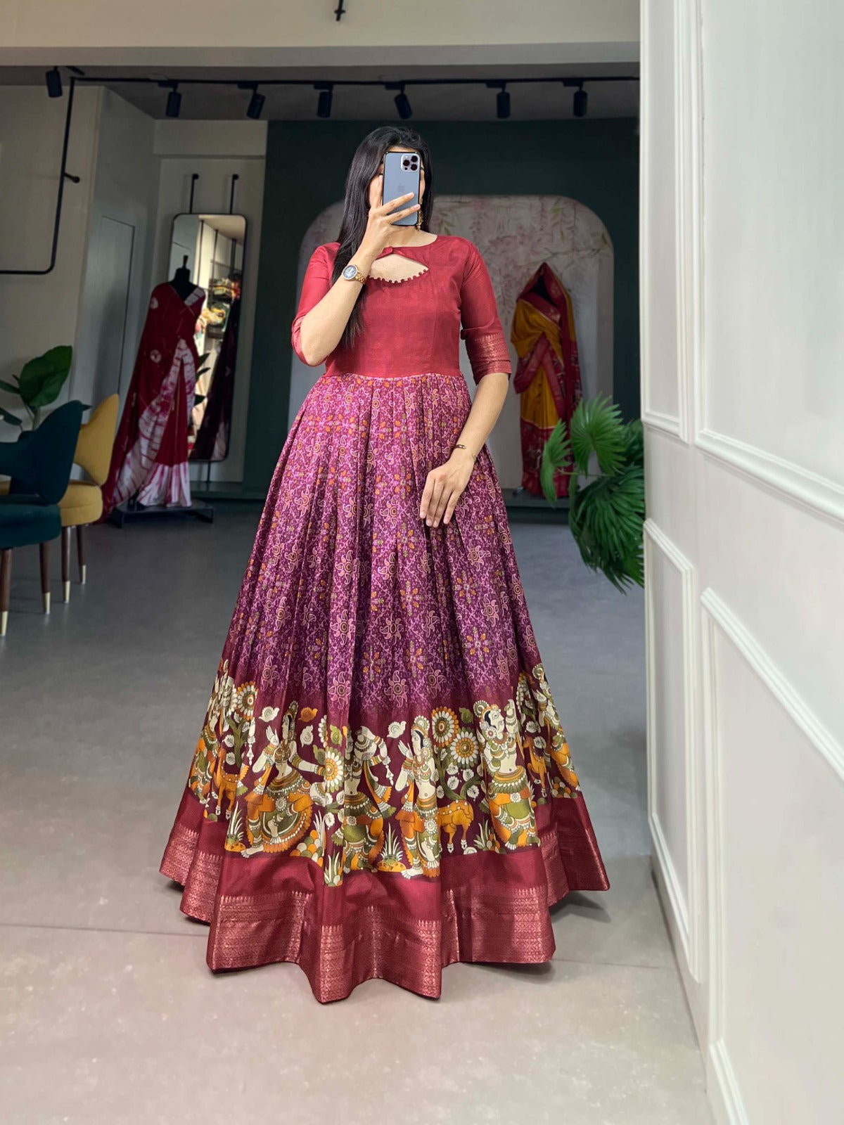 Adorn yourself in the poetry of prints, as the gown weaves dreams of beauty and tradition