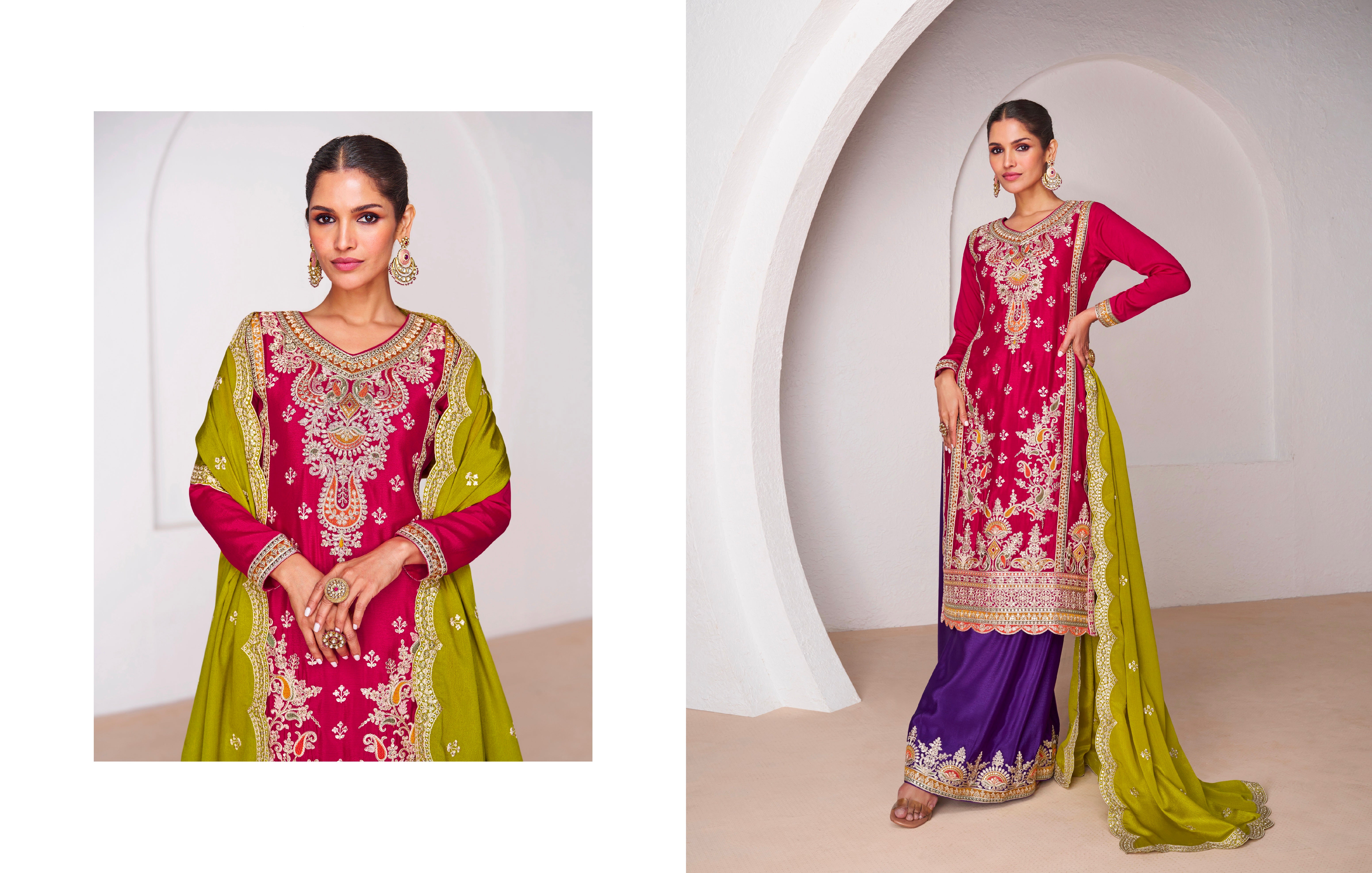 Red Chinnon Silk Anarkali Suit with Purple Palazzo and Green Dupatta