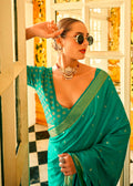 This teal and gold lehenga features intricate embroidery and mirror work, paired with a pink dupatta for a stunning, regal look.