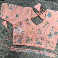 This peach lehenga showcases exquisite embroidery and mirror work on silk, complemented by a soft pink dupatta for a timeless elegance.