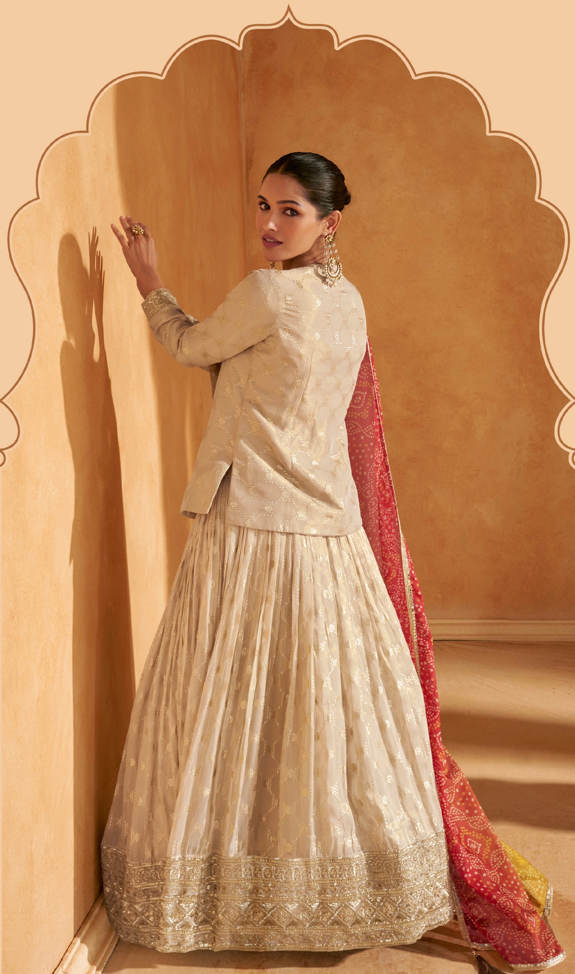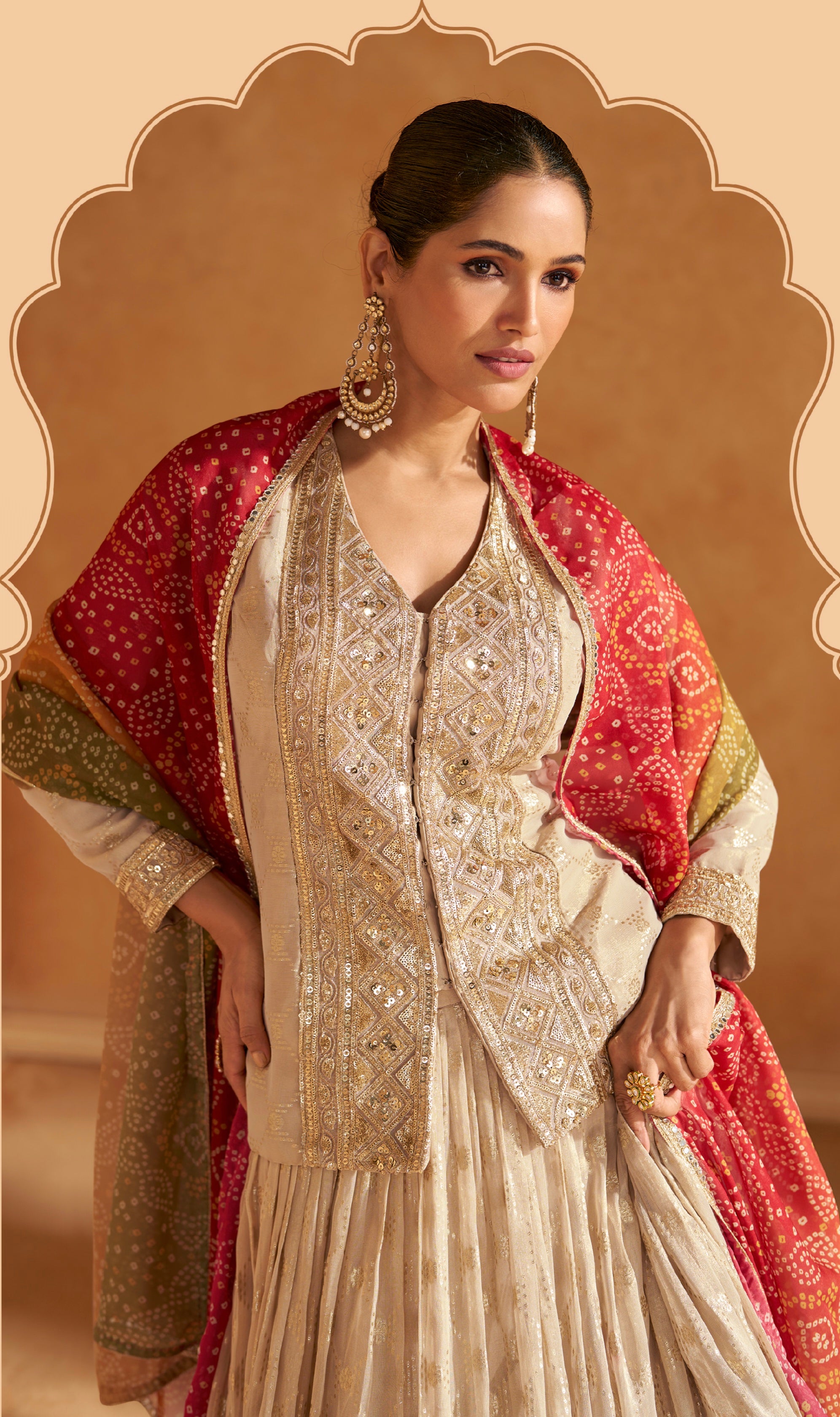 The standout feature of this Anarkali suit is its vibrant multicolored dupatta. Adorned with intricate embroidery and tassels, the dupatta in shades of red, green, and gold provides a beautiful contrast to the soft beige Anarkali. The voluminous cancan flare adds drama and a regal feel, making you the center of attention at any event.
