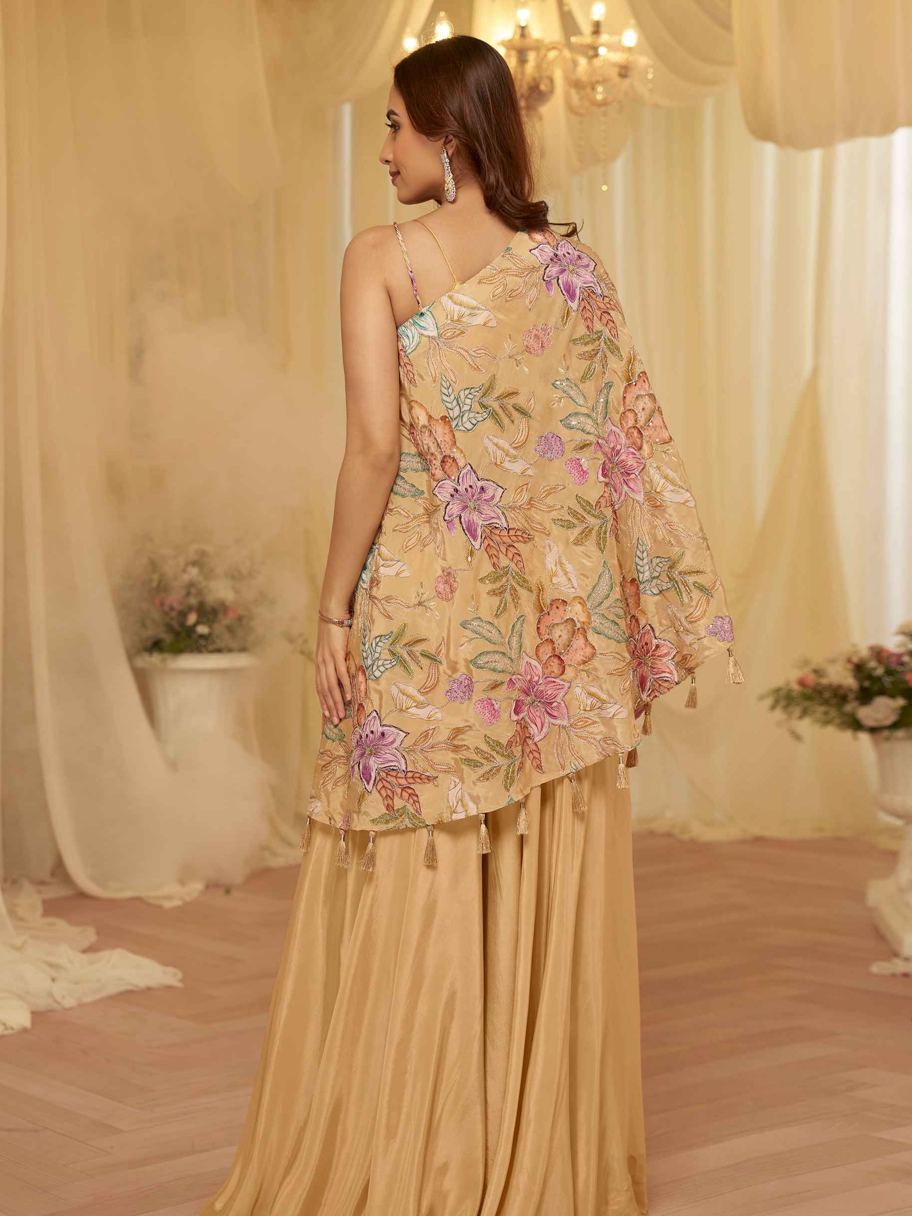 Beige Floral Embroidered Kaftan Palazzo Set in Premium Viscose Crepe