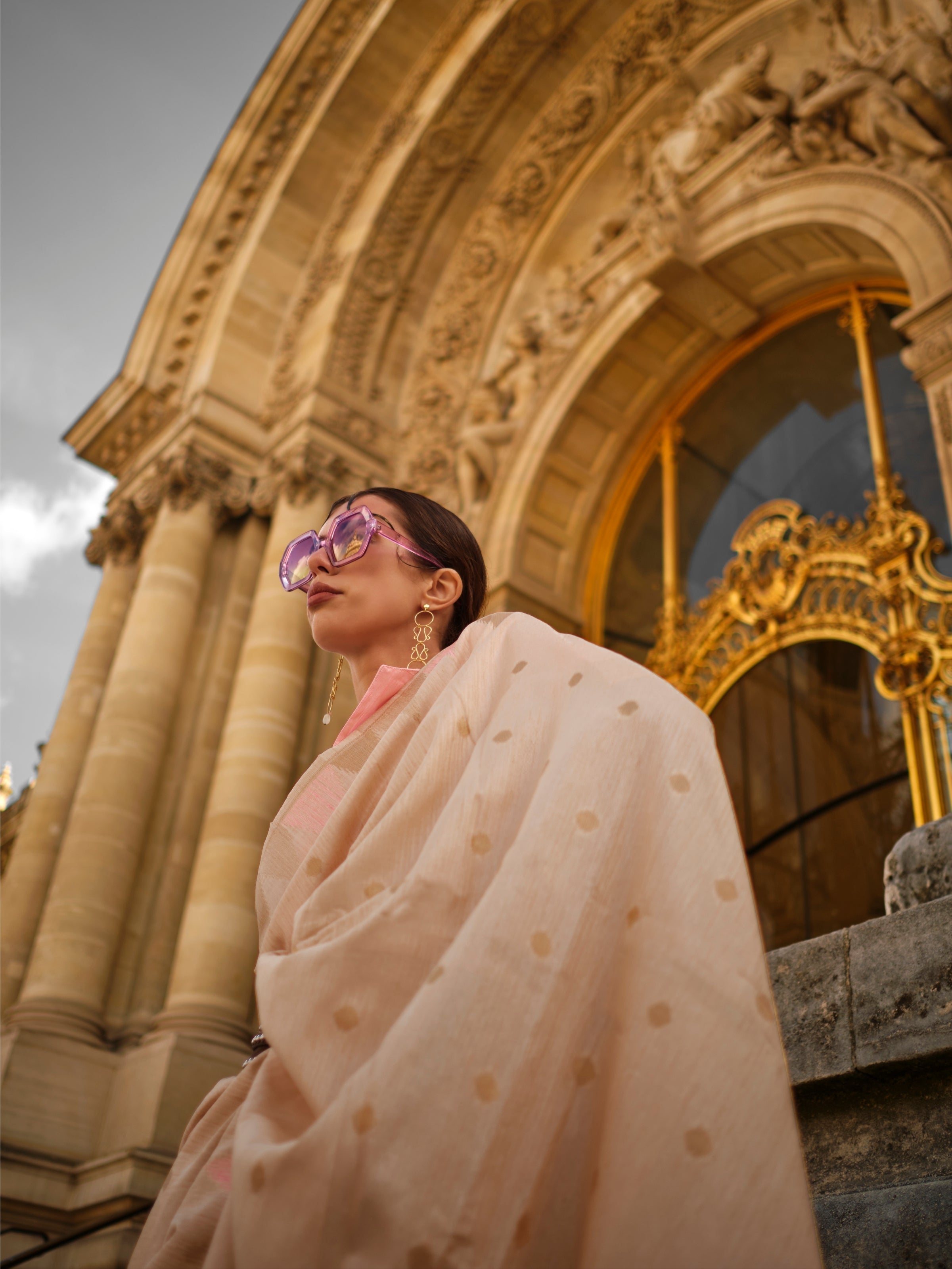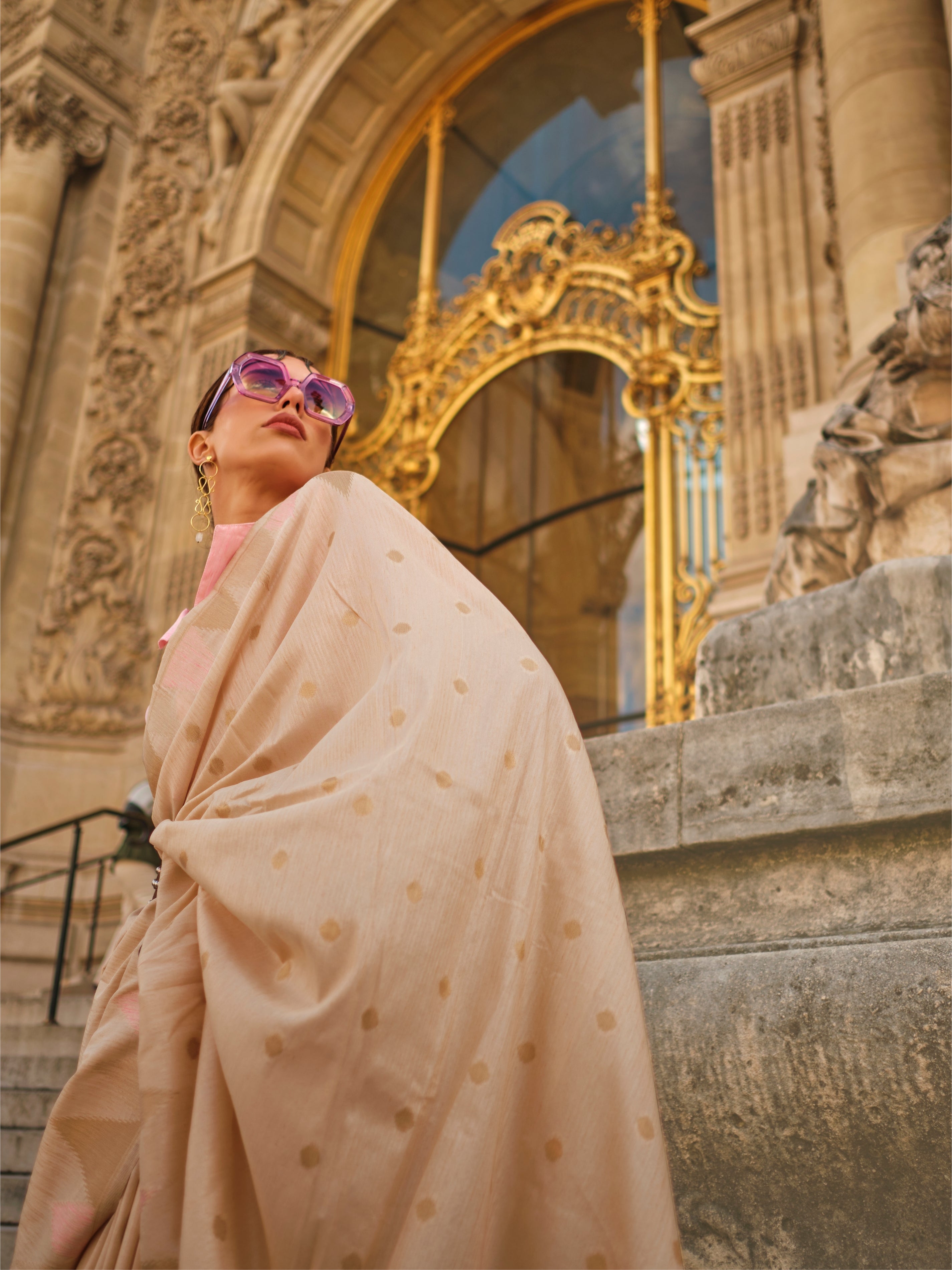 Beige & Pink Kanchipuram Silk Saree with Heavy Gold Zari Weaving