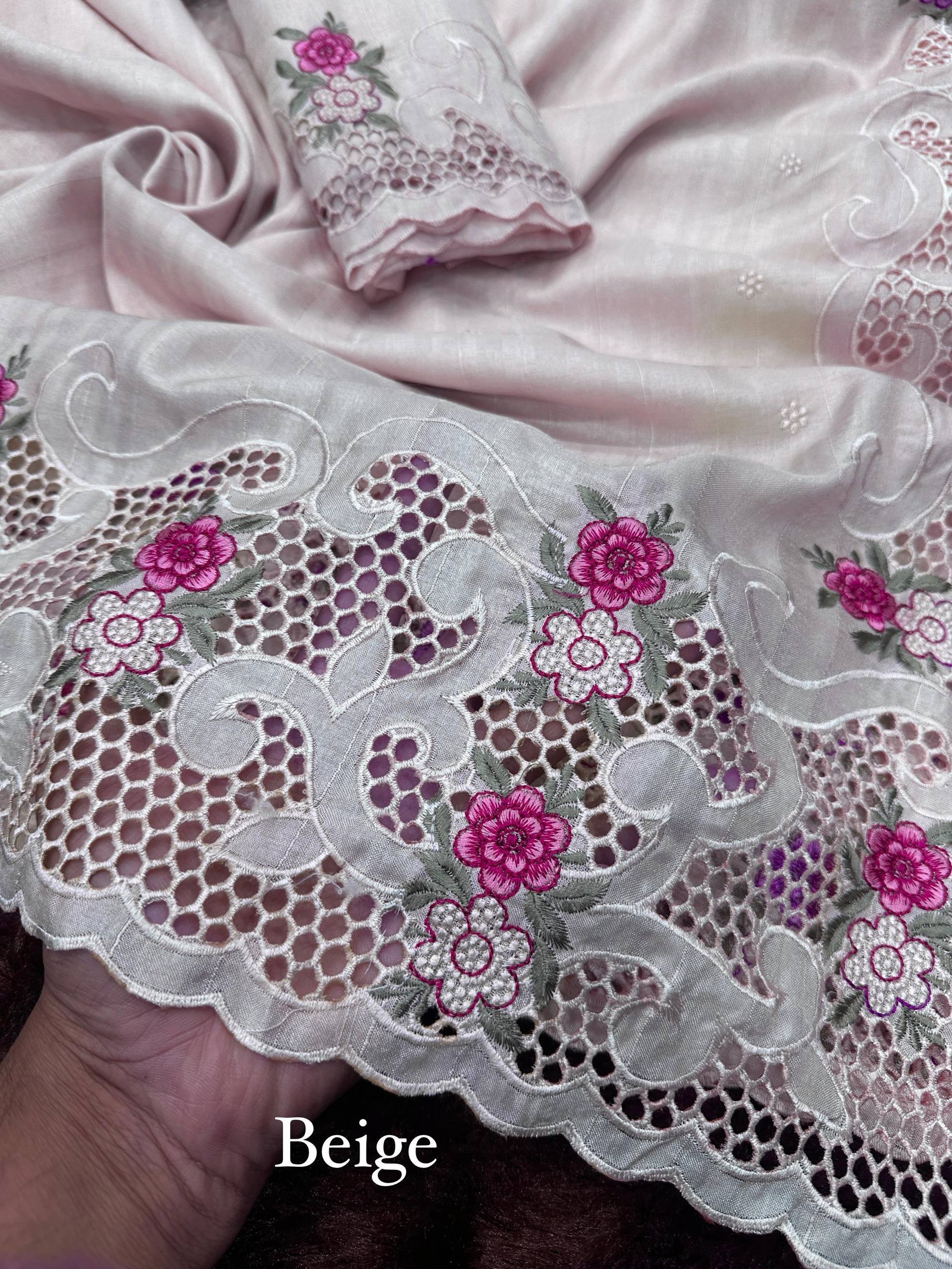 Beige Pure Tussar Cotton Cut Work Tussar Cotton Saree