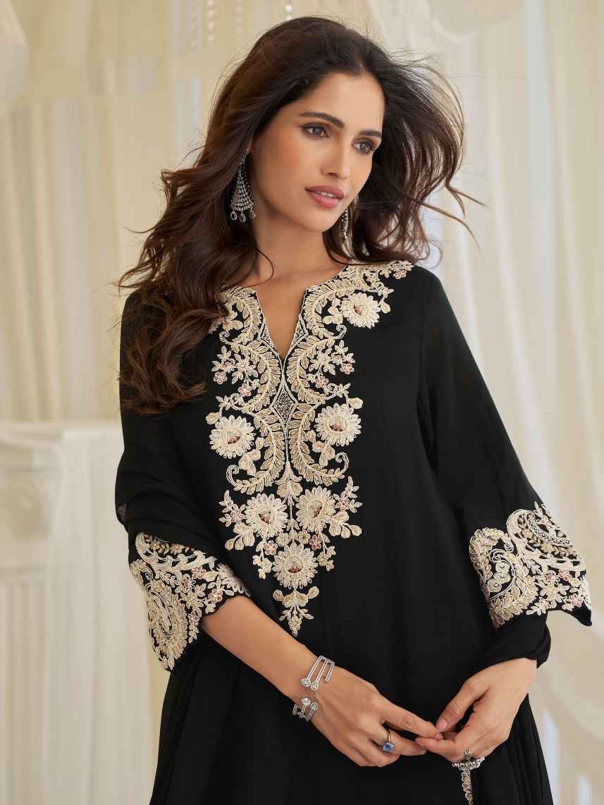 Black Beads Embroidered Chinon Silk Kurti Sharara Set with Dupatta