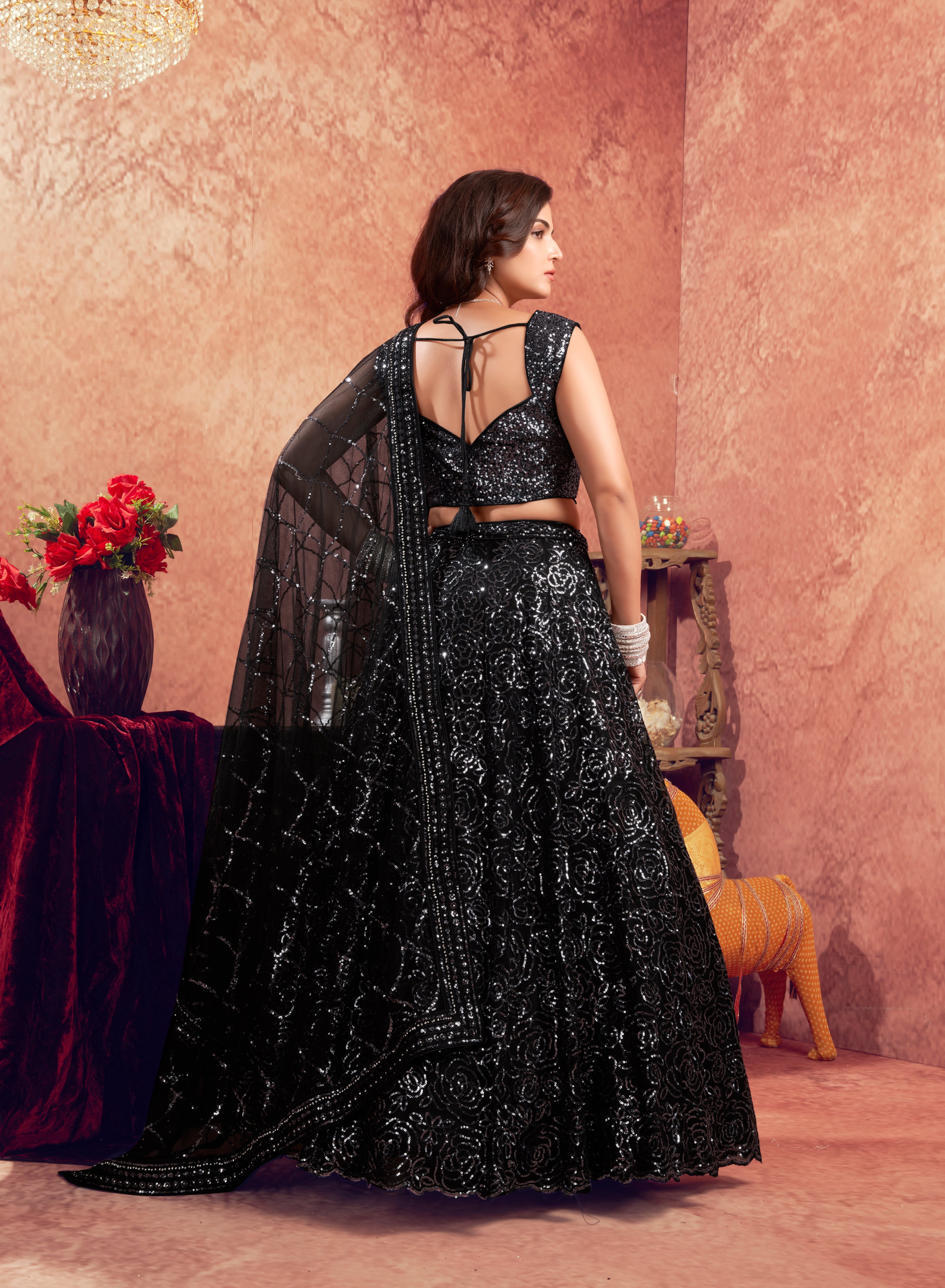 Make a timeless statement with our Classic Blossom Black Net Lehenga Choli, adorned with heavy sequins embellishments. This elegant outfit is perfect for festive occasions, parties, and weddings, offering a blend of traditional style and modern glamour. Crafted from premium net fabric, it ensures both comfort and sophistication, making you the center of attention.