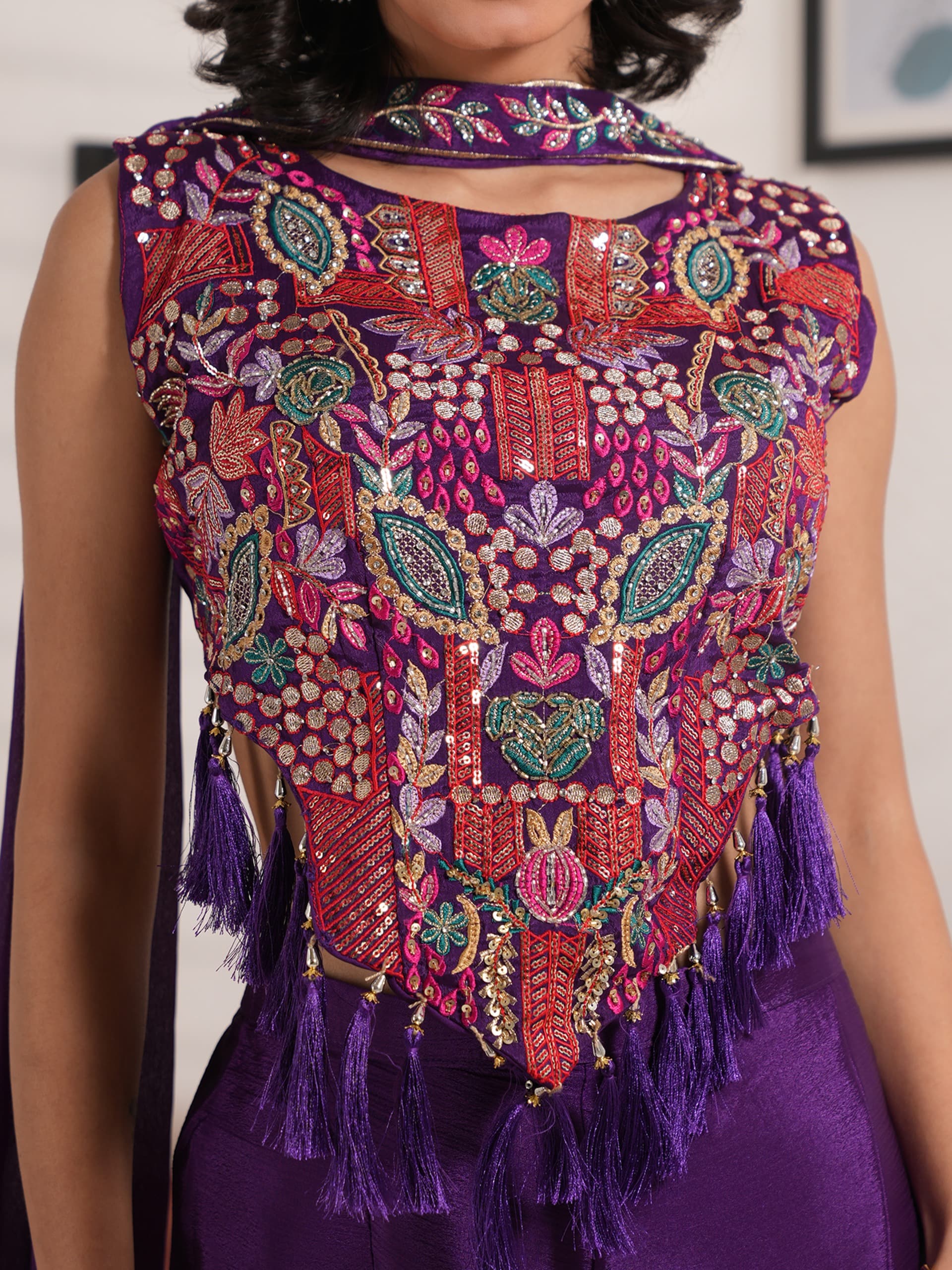 Blue Pure Chinon Crop Top With Floral Printed & Embroidered Readymade Dress