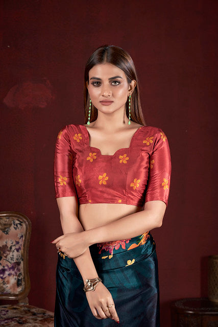 Blue Pure Soft Crape With Flower Print Satin Saree
