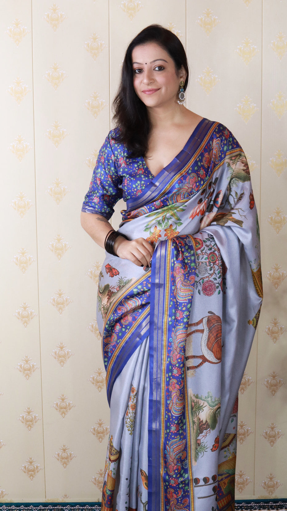 Blue Soft Tussar Silk Pattachitra Traditional Printed Zari Tussar Saree