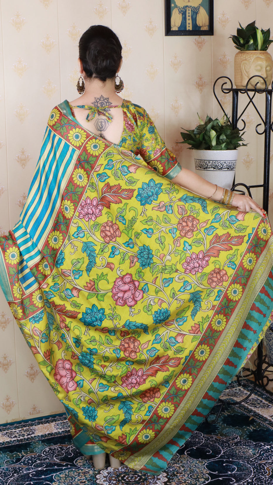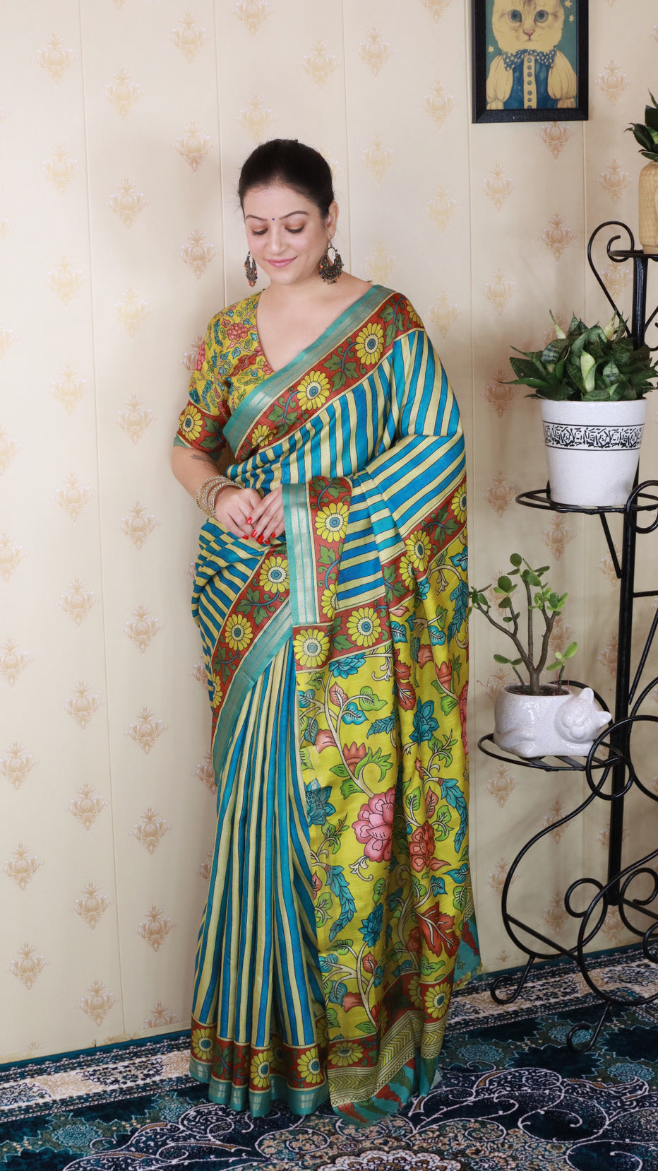 Blue Soft Tussar Silk Striped Kalamkari Printed Zari Tussar Saree